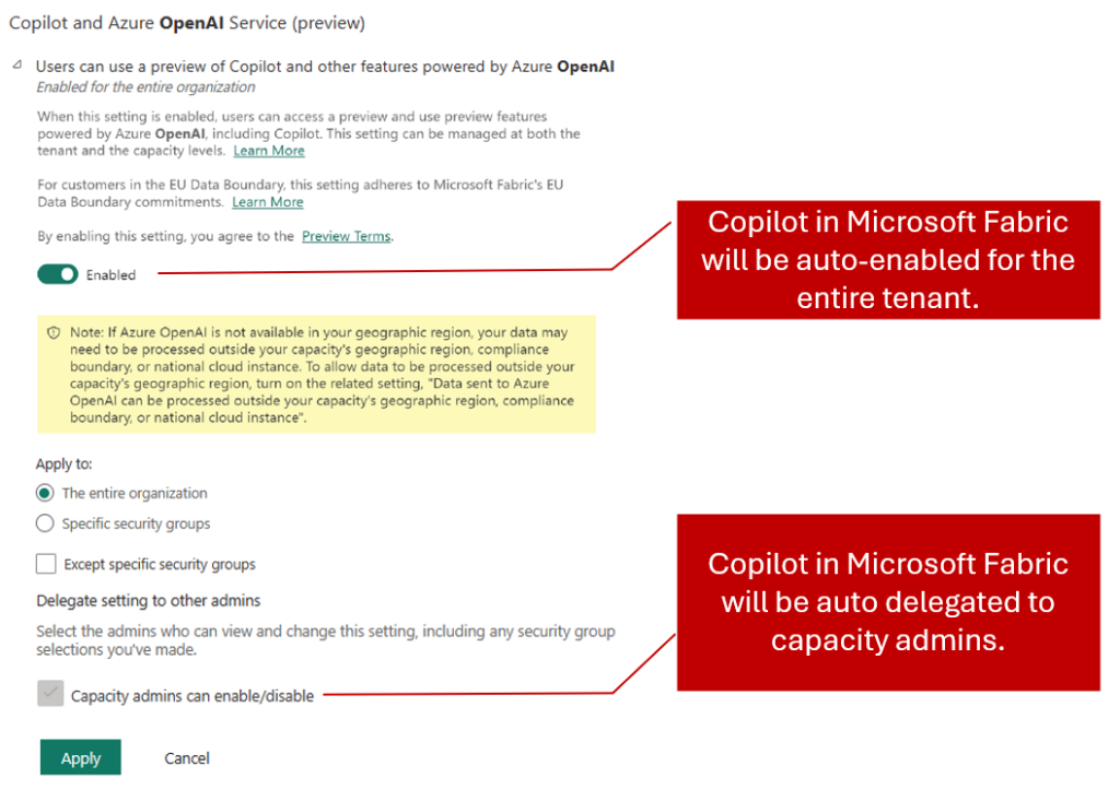 Copilot pour Microsoft Fabric est désormais activé par défaut dans le portail d’administration Fabric. Les administrateurs peuvent désactiver Copilot si leur organisation n’est pas prête à l’utiliser.