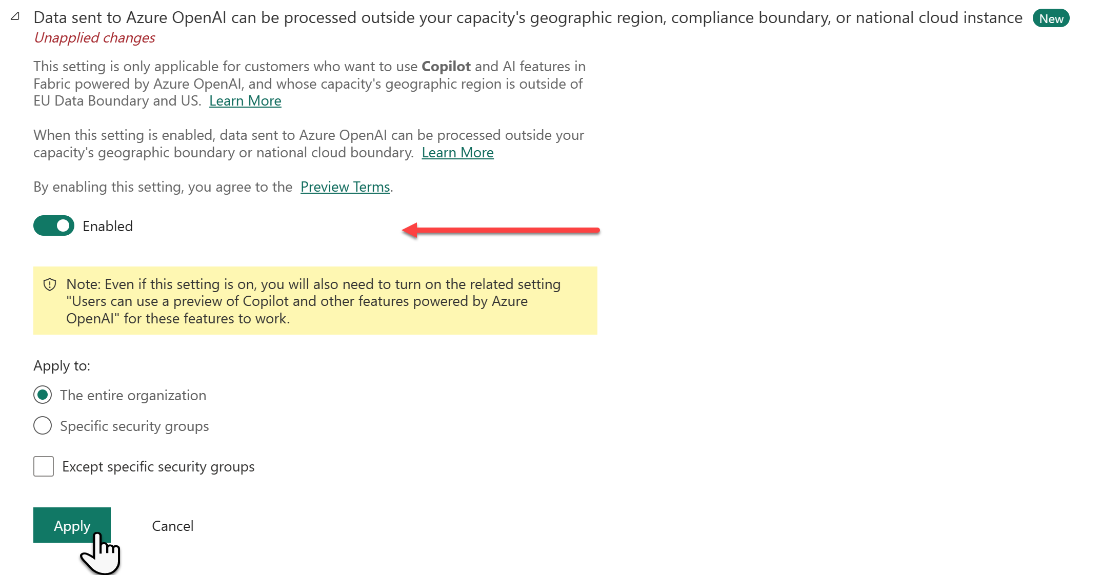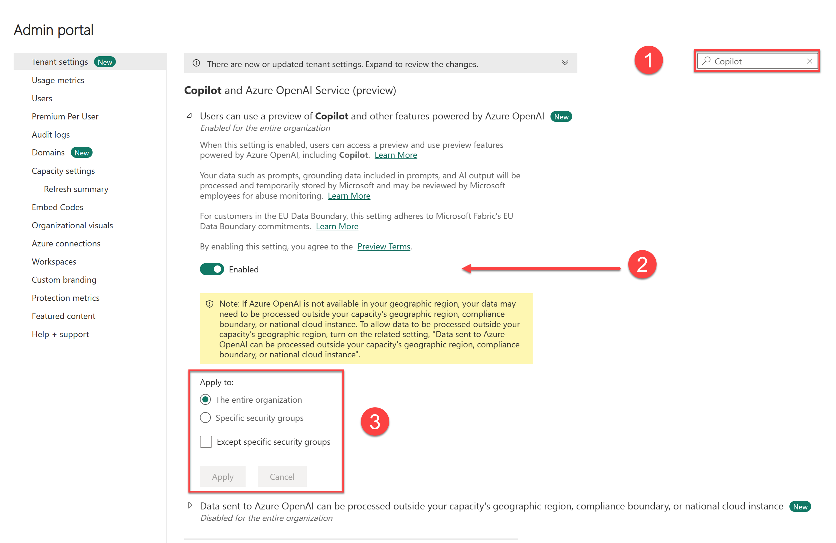 - Dans le paramètre les utilisateurs peuvent utiliser Copilot et d’autres fonctionnalités optimisées par Azure OpenAI, activez le commutateur Activé. Ce paramètre est désactivé par défaut.
