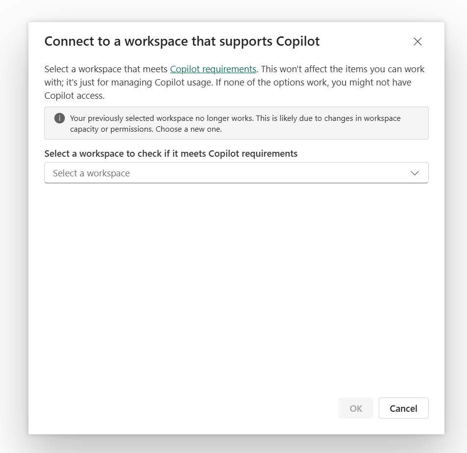 La sélection du bouton Sélectionner un espace de travail répertorie les espaces de travail auxquels vous avez accès et qui peuvent utiliser Copilot. Après avoir sélectionné un espace de travail, Power BI vérifie si Copilot est activé. Si c’est le cas, Power BI utilise cet espace de travail pour surveiller l’utilisation.