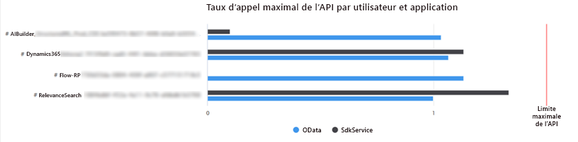 | SDSService et OData | Les barres indiquent le nombre maximum de requêtes d’API par application/utilisateur dans un intervalle de 5 minutes. Le maximum correspond au nombre de requêtes par utilisateur toutes les cinq minutes, qui est basé sur vos licences et modules complémentaires de capacité. |