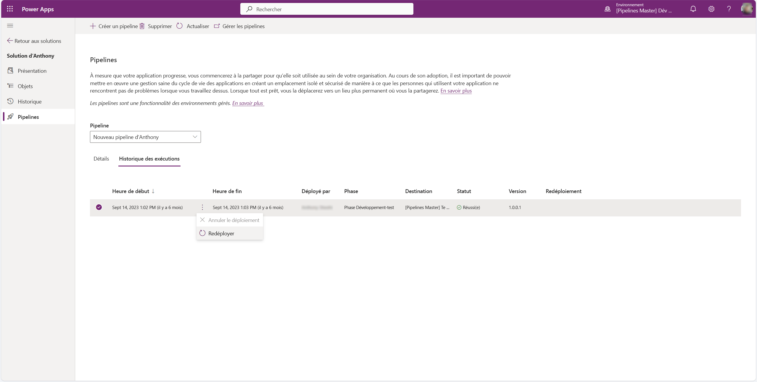 Avec les pipelines dans Power Platform, les créateurs et les administrateurs ont le pouvoir de redéployer les anciennes versions de la solution Microsoft Dataverse à partir des déploiements réussis précédents.
