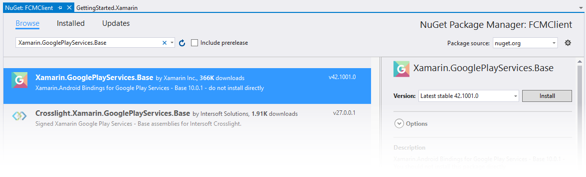 Étant donné que Firebase Cloud Messaging dépend de Google Play Services, le package NuGet de base Xamarin - Doit être ajouté au projet Xamarin.Android. Vous aurez besoin de la version 29.0.0.2 ou ultérieure.