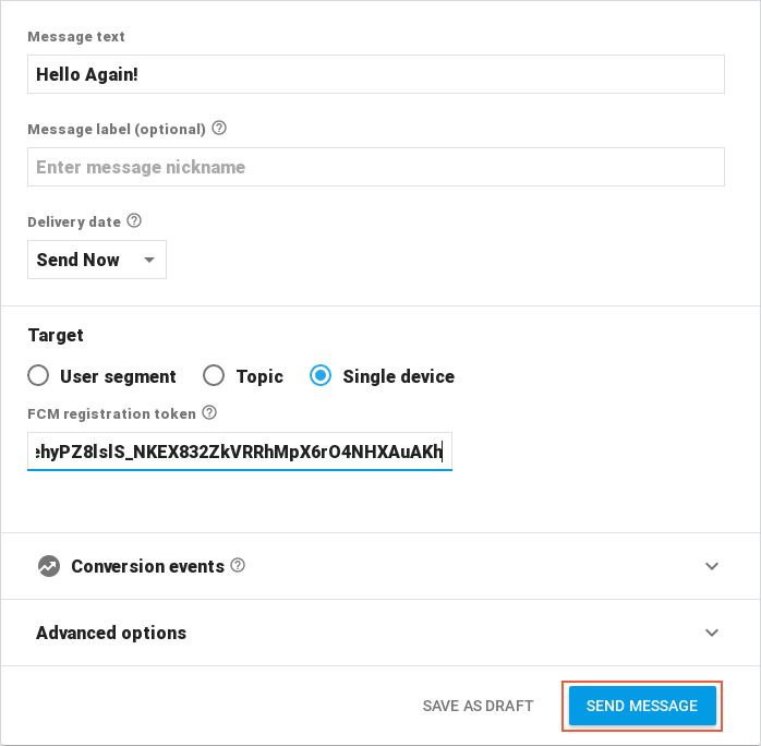 Lorsque l’appareil est prêt, cliquez sur ENVOYER UN MESSAGE dans la console Firebase.