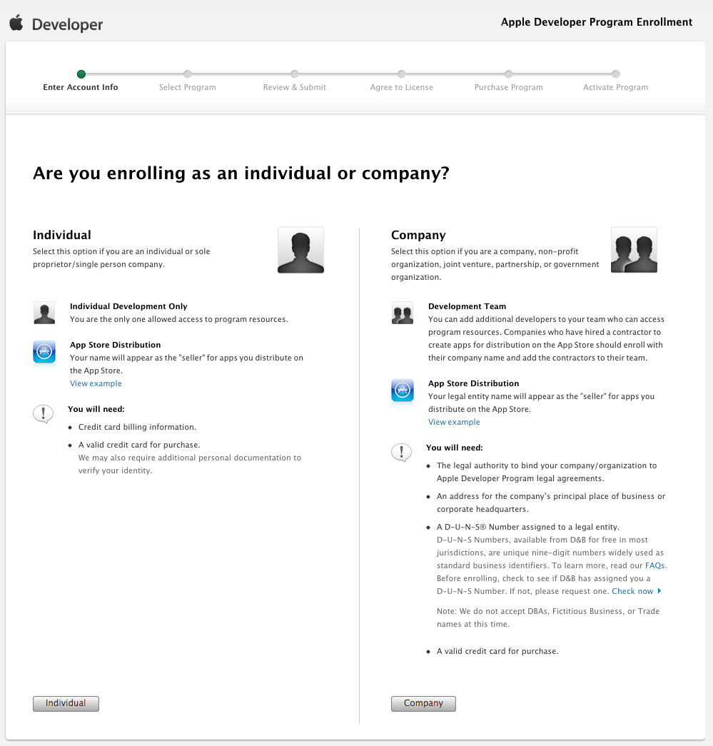 Lorsque vous rejoignez le Programme de développement Mac, le développeur sera proposé un choix pour se joindre en tant qu’individu ou entreprise, comme illustré dans la capture d’écran ci-dessous :