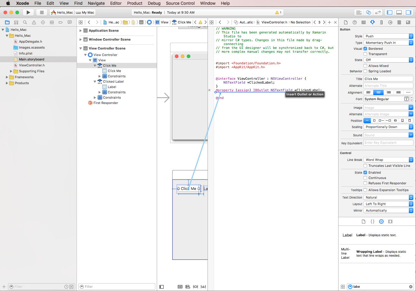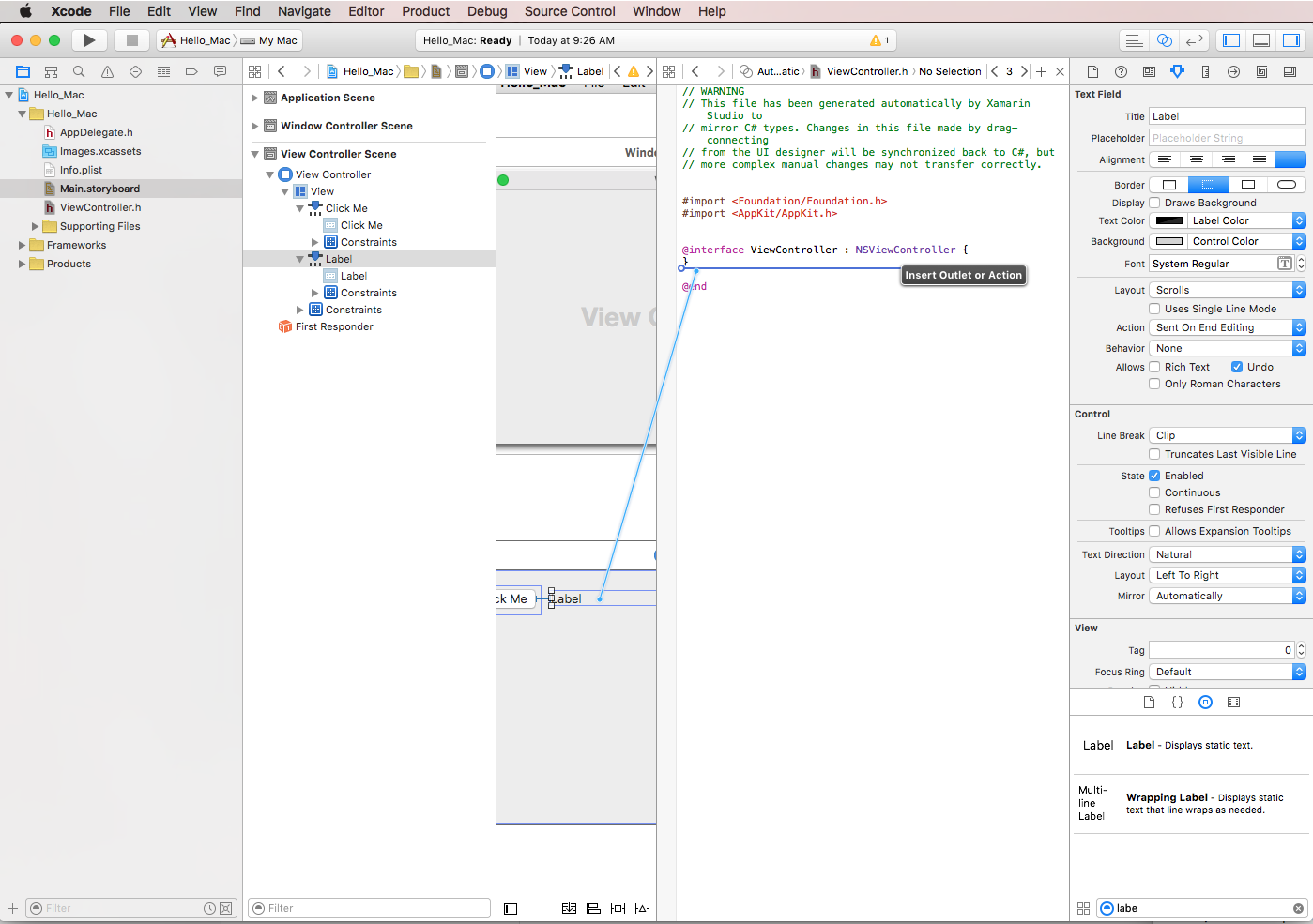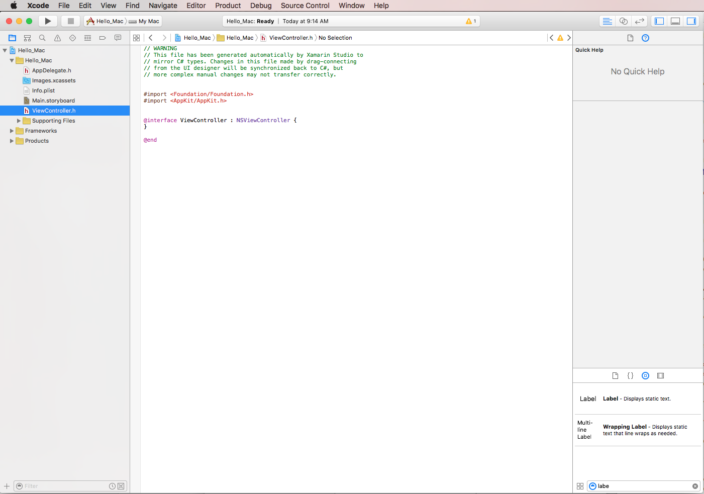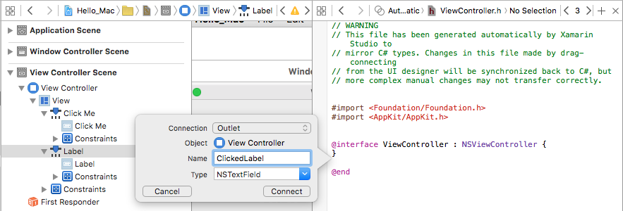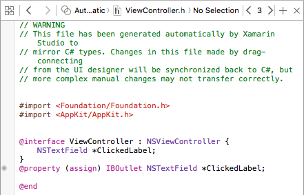 Pour les développeurs Xamarin.Mac, cela signifie que le développeur fera glisser vers les Objective-C fichiers stub qui correspondent au fichier C# où il souhaite créer la sortie ou l’action. Visual Studio pour Mac a créé un fichier appelé ViewController.h dans le cadre du projet Xcode shim qu’il a généré pour utiliser Interface Builder :