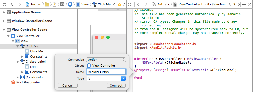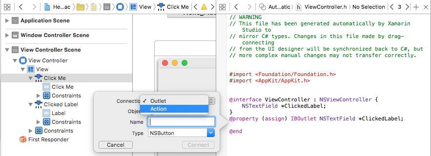 @property (assign) IBOutlet NSTextField *ClickedLabel;:Remplacez le type de Connexion par Action :