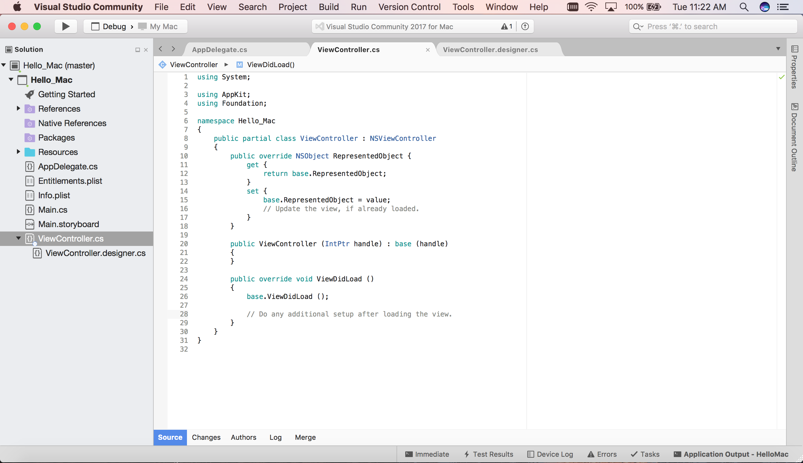- ViewController.cs est le contrôleur pour la fenêtre principale. Les contrôleurs seront abordés en détail dans un autre article, mais pour l’instant, un contrôleur peut être considéré comme étant le moteur principal de n’importe quelle vue particulière.
