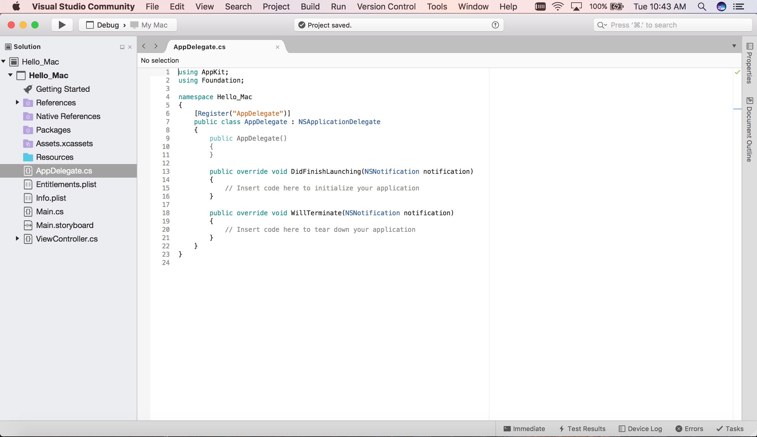 Visual Studio pour Mac crée l’application Xamarin.Mac et affiche les fichiers par défaut qui sont ajoutés à la solution de l’application :