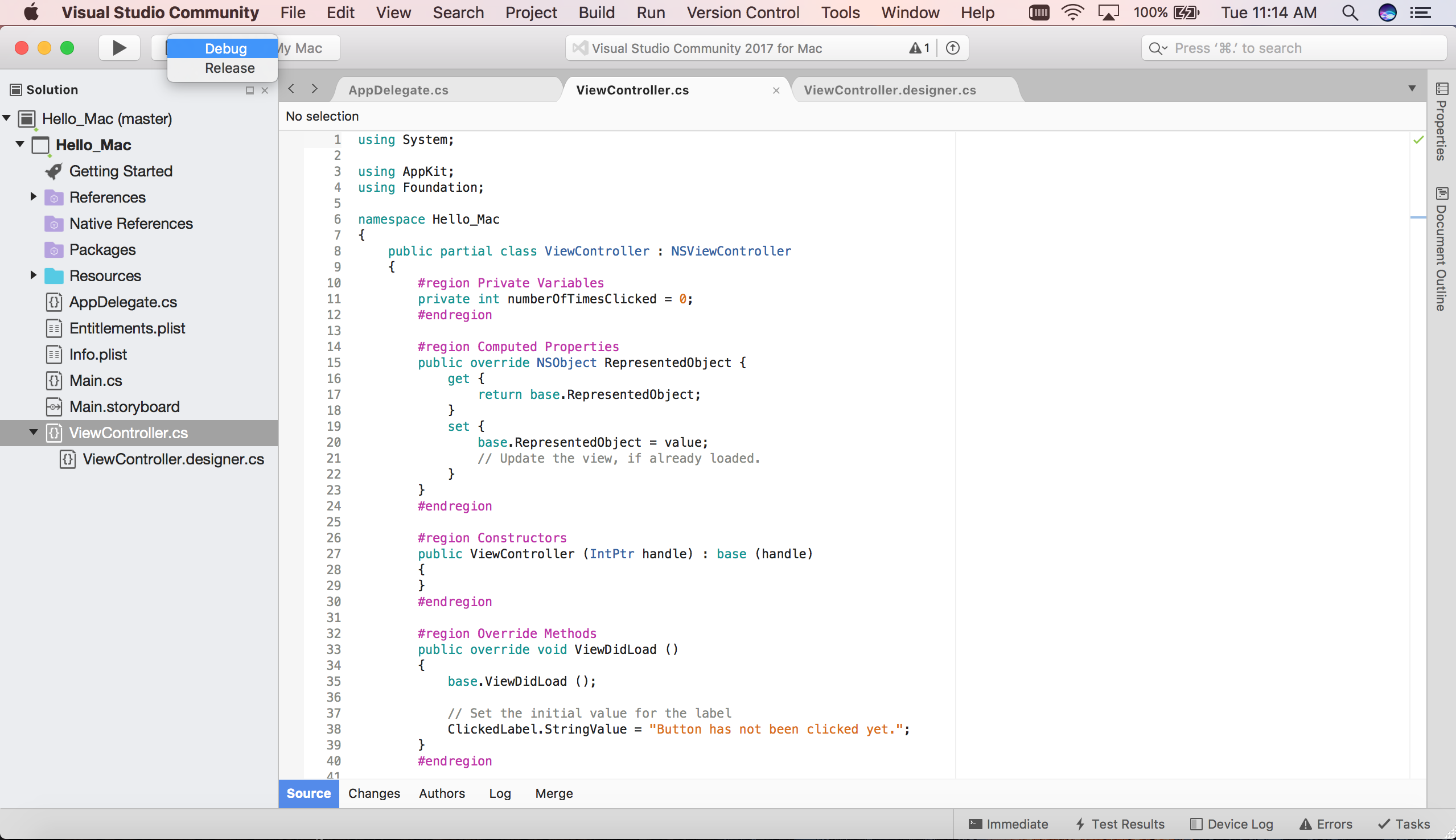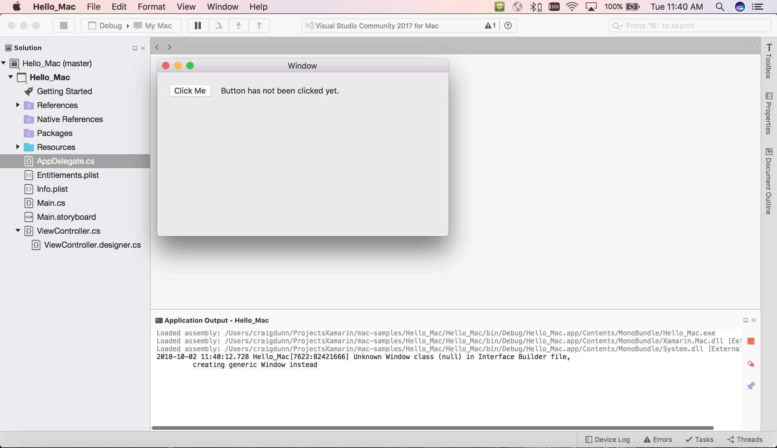 Cet article vous présente les concepts clés nécessaires pour créer une application Mac à l’aide de Xamarin.Mac, Visual Studio pour Mac et Interface Builder de Xcode en passant en revue le processus de génération d’une simple application Hello, Mac qui compte le nombre de clics sur un bouton :
