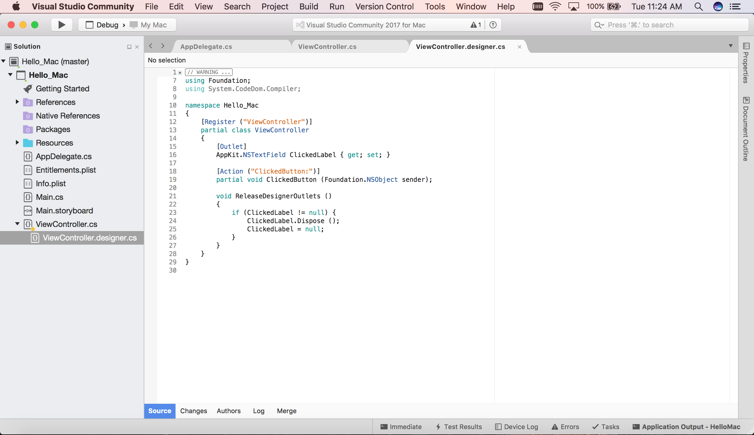 Visual Studio pour Mac écoute les modifications apportées au fichier .h, puis synchronise automatiquement ces modifications dans le fichier . designer.cs respectif pour les exposer à l’application. Notez que ViewController.designer.cs étant une classe partielle, Visual Studio pour Mac n’a pas à modifier ViewController.cs, ce qui remplacerait toutes les modifications que le développeur a apportées à la classe.