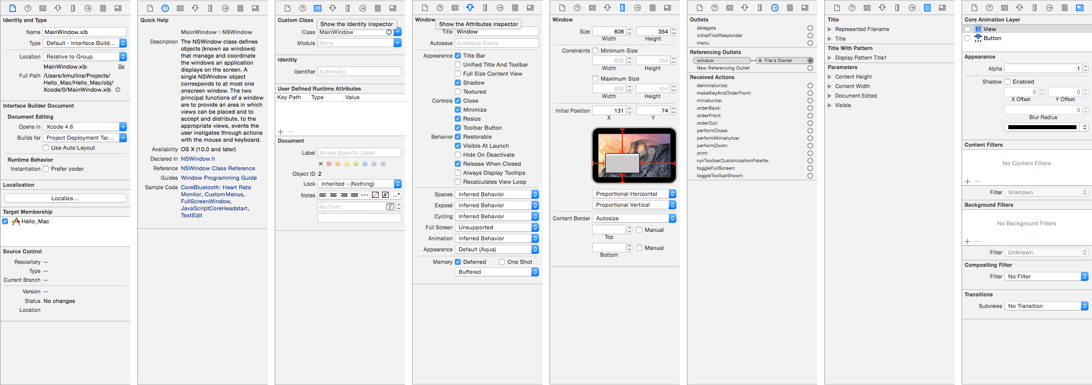 Pour l’exemple Hello World, aucun droit n’est requis. La section suivante montre comment utiliser Interface Builder de Xcode pour modifier le fichier Main.storyboard et définir l’interface utilisateur de l’application Xamarin.Mac.