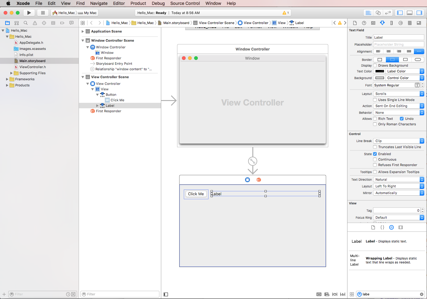 Comme indiqué ci-dessus, ce guide passe en revue les étapes pour créer une application Mac appelée Hello_Mac qui ajoute un seul bouton et une étiquette à la fenêtre principale. Quand vous cliquez sur le bouton, l’étiquette affiche le nombre de clics effectués.