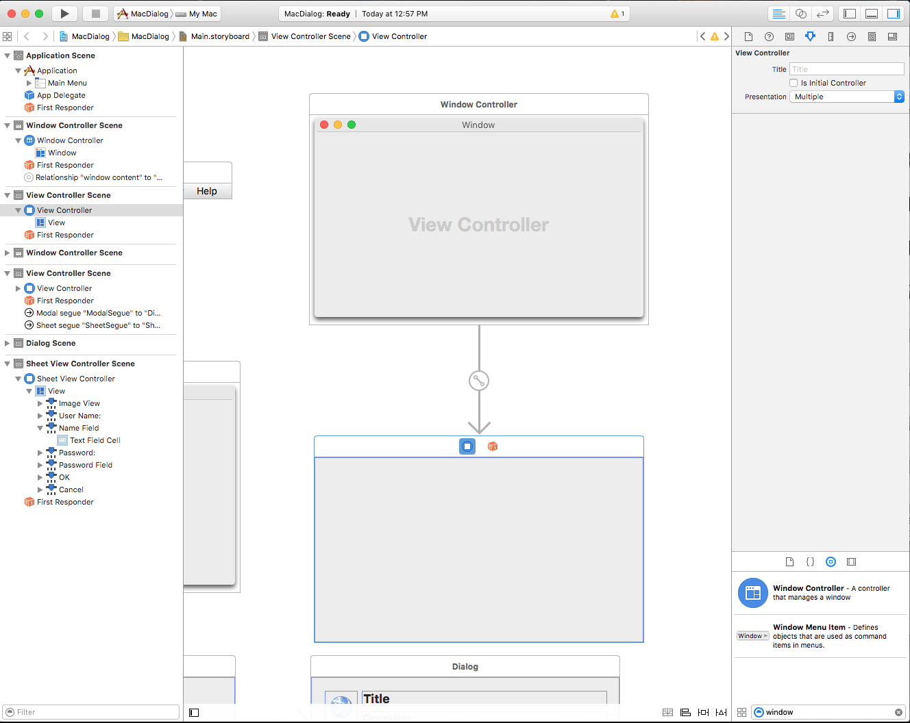 Créez un segue modal à partir de la fenêtre principale de votre application vers le nouveau contrôleur d’affichage en faisant glisser le contrôle à partir de l’élément d’interface utilisateur qui ouvre la boîte de dialogue vers la fenêtre de la boîte de dialogue. Attribuez l’identificateur