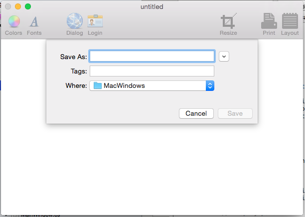 Si nous définissons la ShowSaveAsSheet propriété falsesur , exécutez l’application et sélectionnez Enregistrer sous... dans le menu Fichier , les éléments suivants s’affichent :