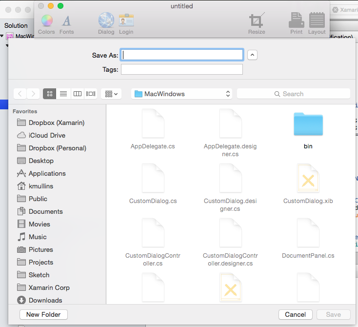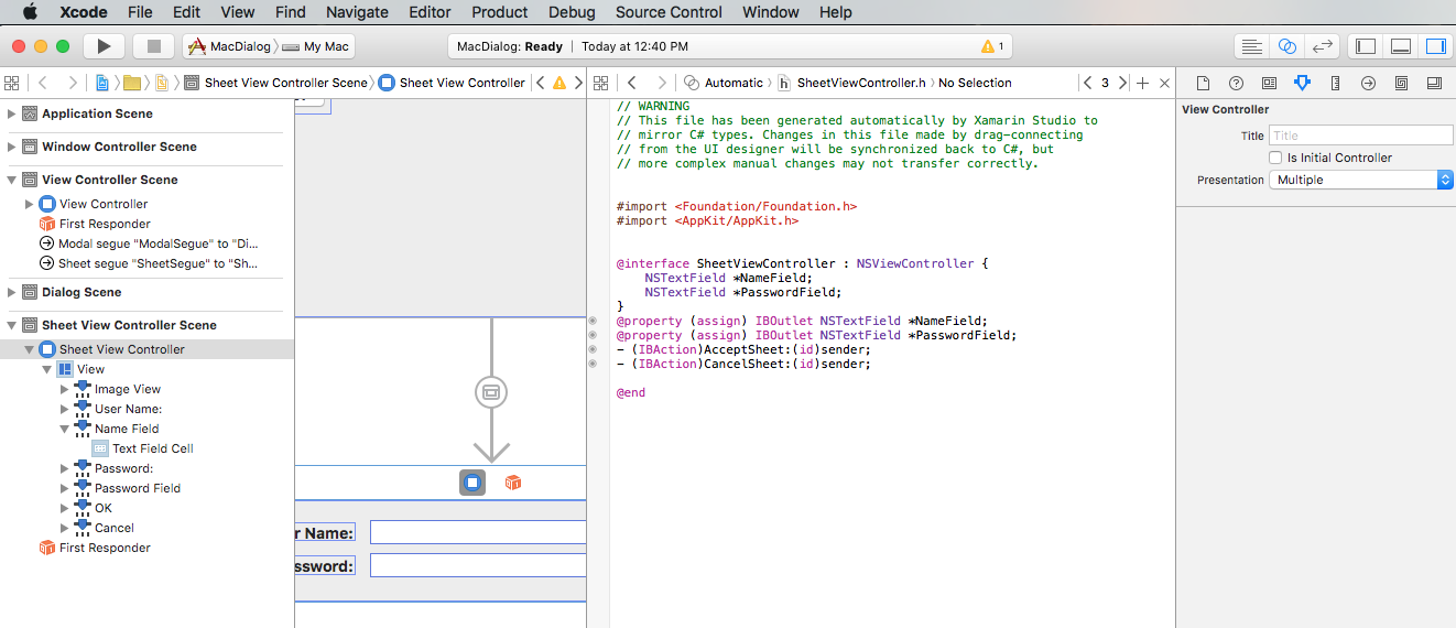Lorsque vous utilisez C# et .NET dans une application Xamarin.Mac, vous avez accès aux mêmes dialogues et Fenêtres modales qu’un développeur travaillant dans Objective-C et Xcode . Étant donné que Xamarin.Mac s’intègre directement à Xcode, vous pouvez utiliser le Générateur d’interface de Xcode pour créer et gérer vos fenêtres modales (ou éventuellement les créer directement dans le code C#).