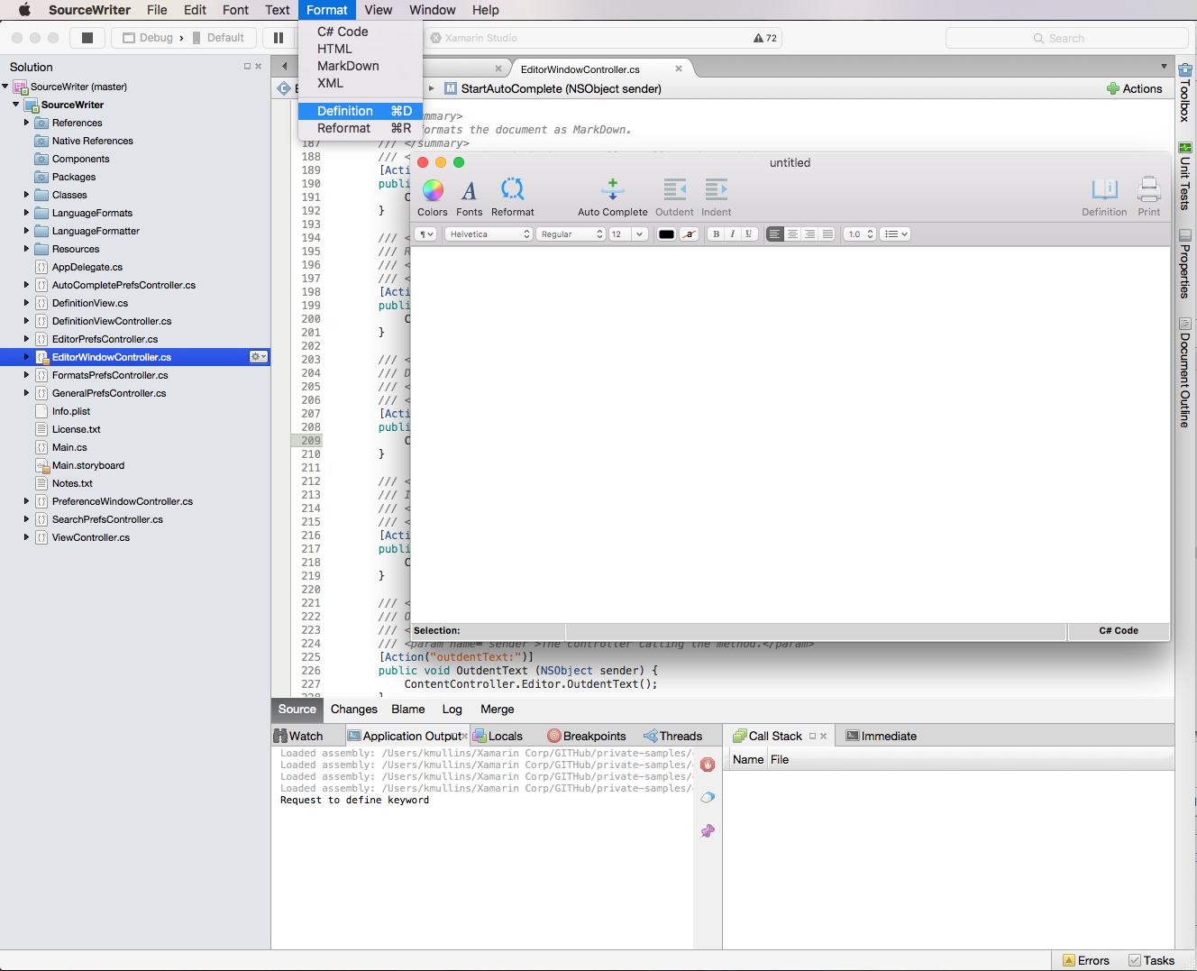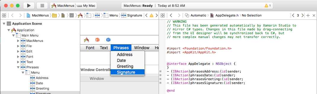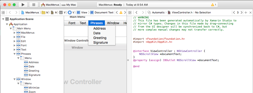 Comme nous l’avons vu ci-dessus, simplement en ajoutant des éléments d’interface utilisateur Cocoa spécifiques à notre conception d’interface utilisateur (par exemple, un champ de texte), plusieurs éléments de menu par défaut sont activés et fonctionnent automatiquement, sans avoir à écrire de code. Examinons ensuite l’ajout de notre propre code C# à notre projet Xamarin.Mac pour activer un élément de menu et fournir des fonctionnalités lorsque l’utilisateur le sélectionne.