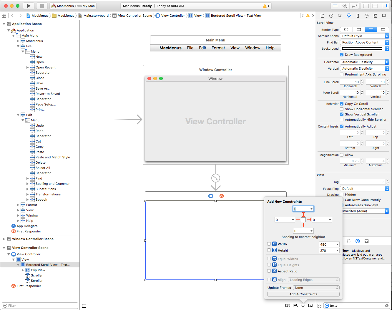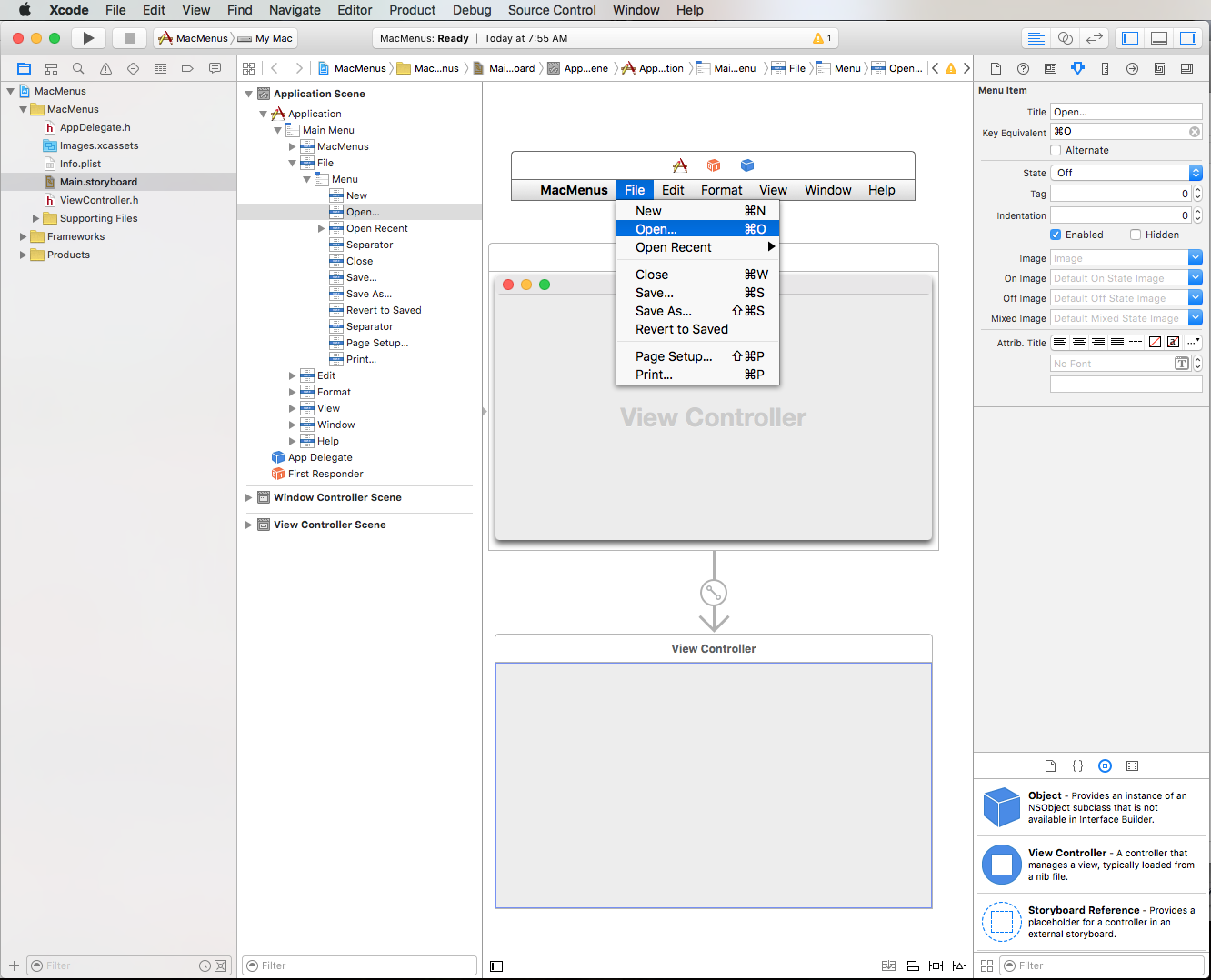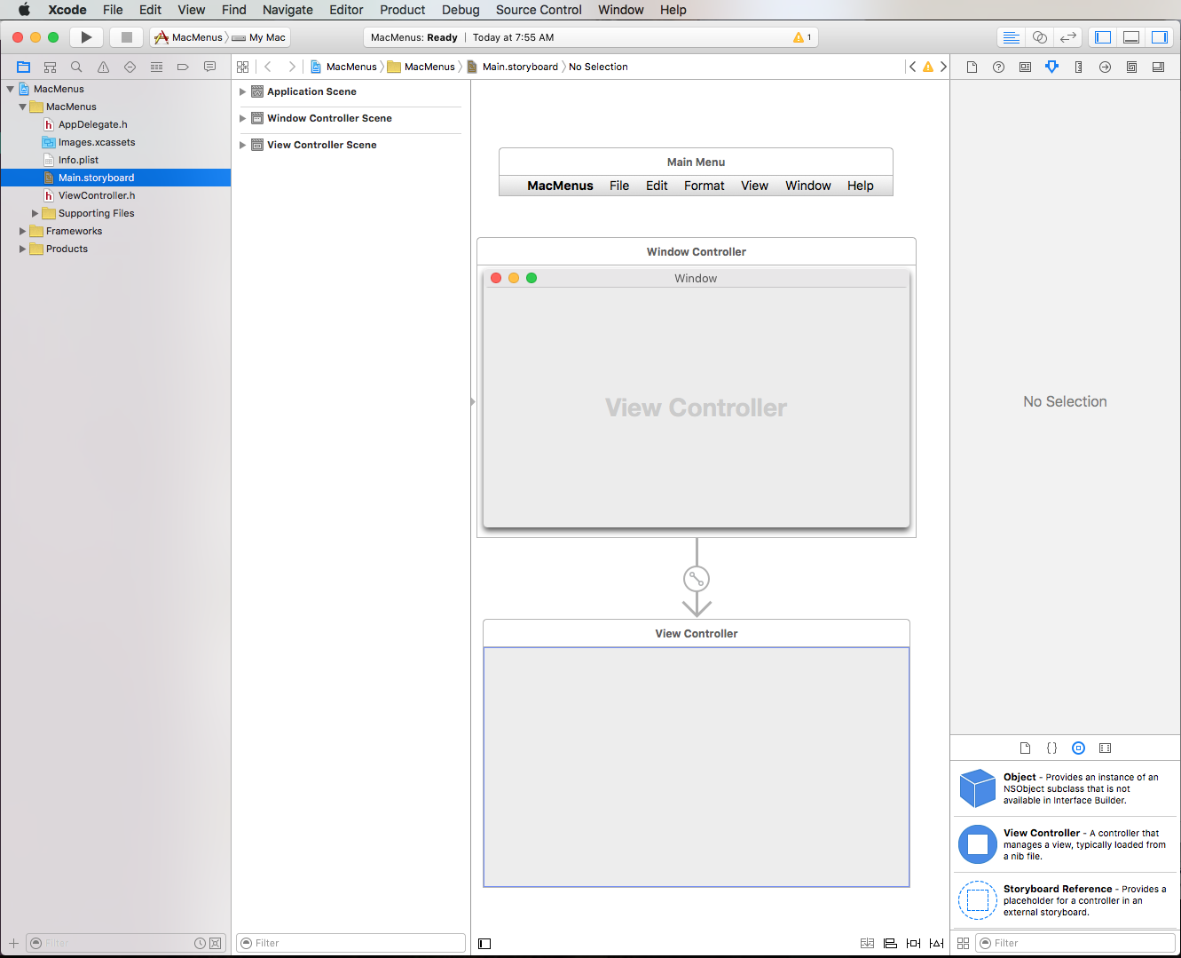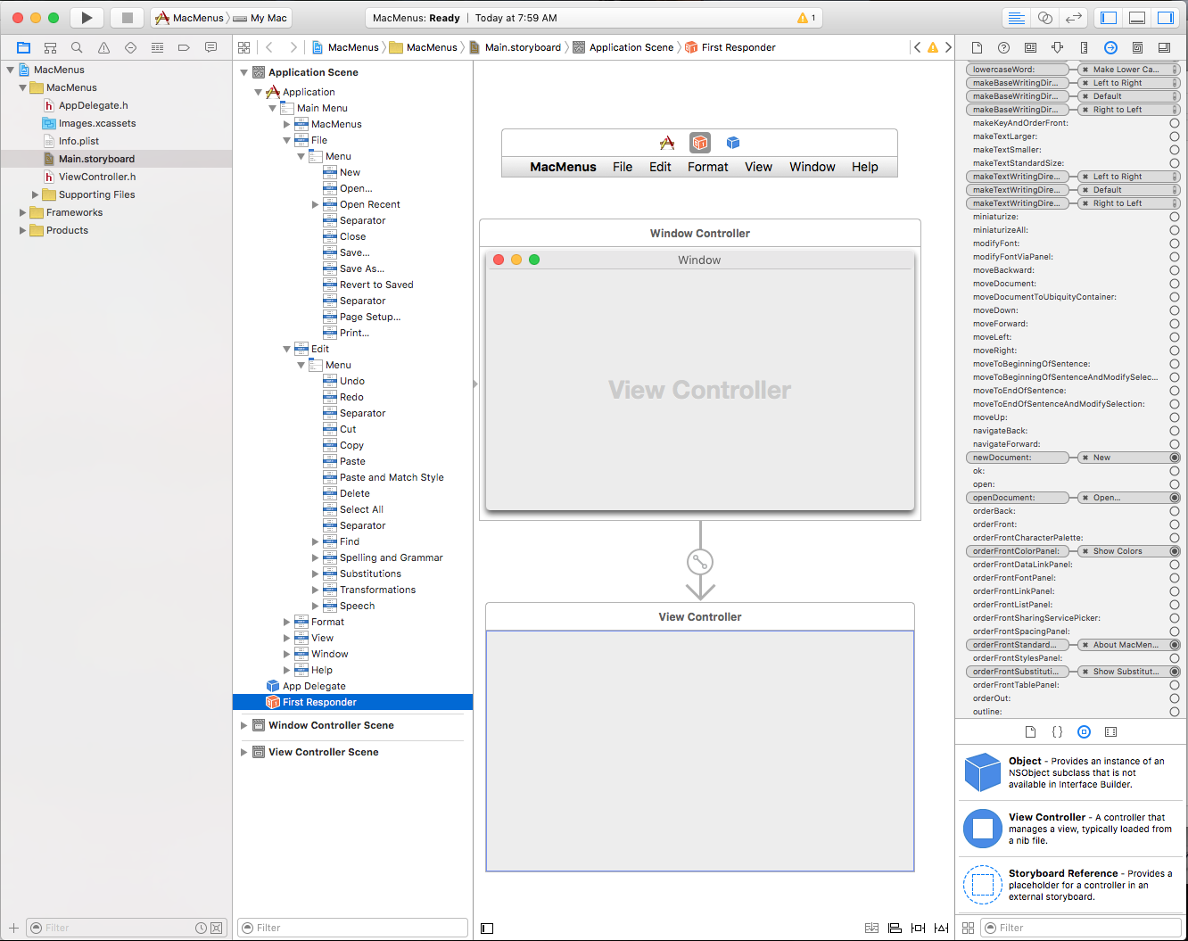 Double-cliquez sur le fichier Main.storyboard pour l’ouvrir pour la modifier dans le Générateur d’interface de Xcode et vous serez présenté avec l’interface de l’éditeur de menu :