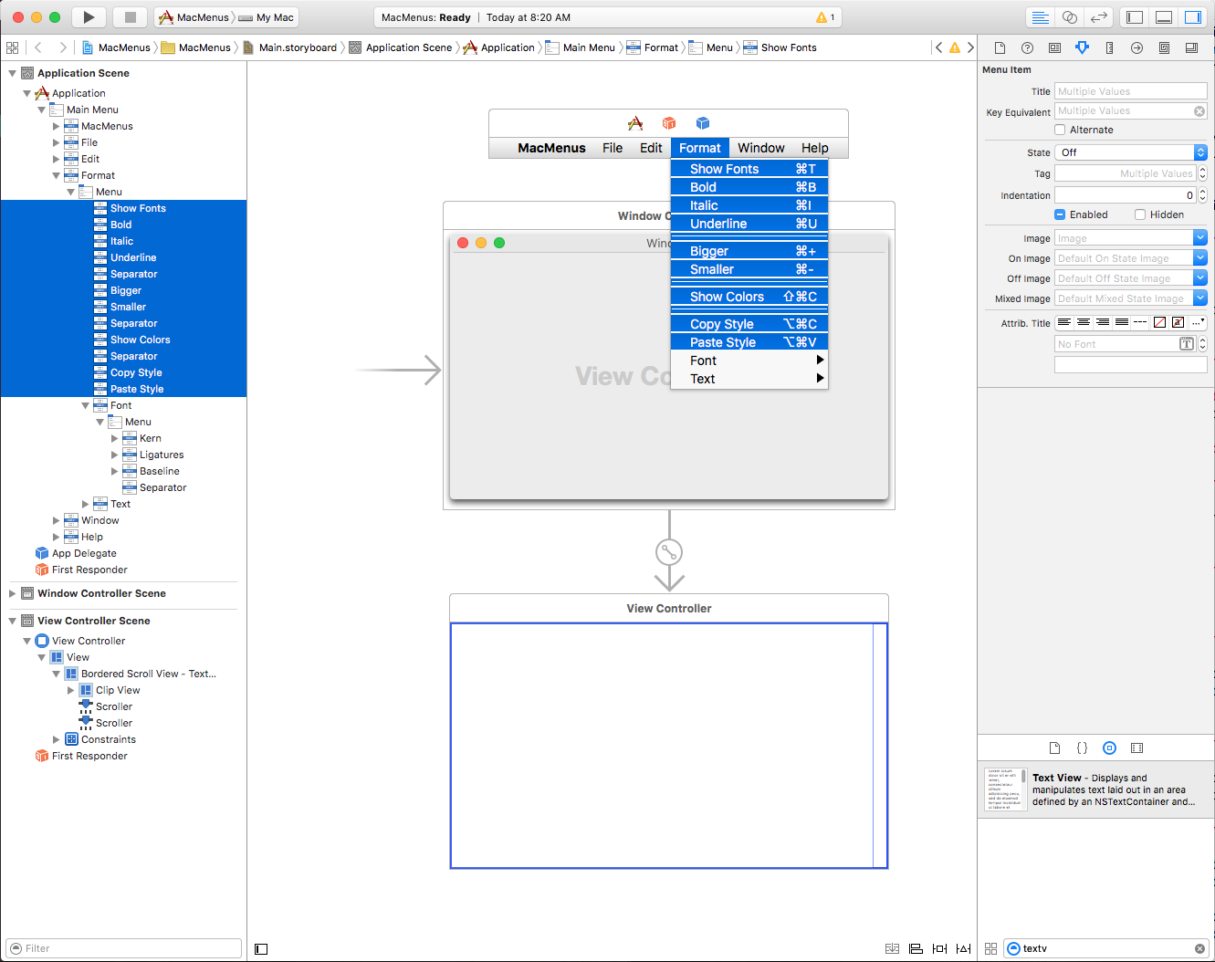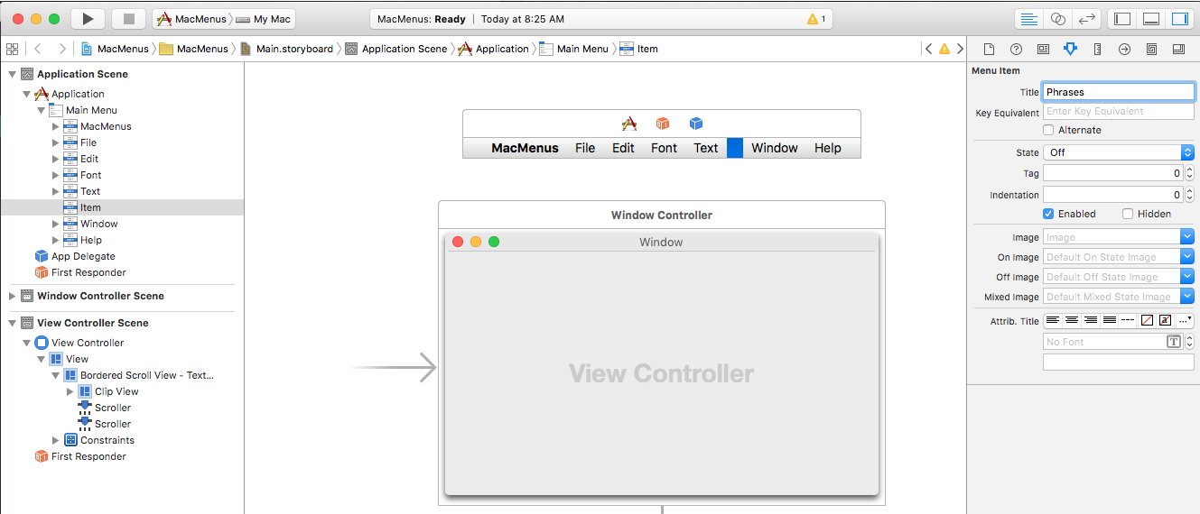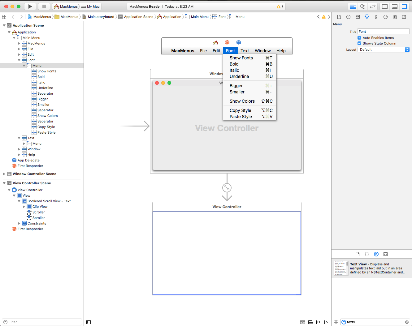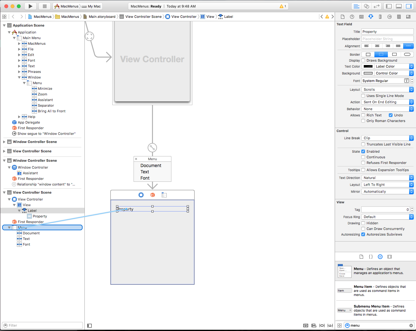 Ensuite, faites glisser un menu de l’inspecteur de bibliothèque sur le contrôleur de vue dans la hiérarchie d’affichage et renommez les trois éléments de menu par défaut Document, Texte et Police :