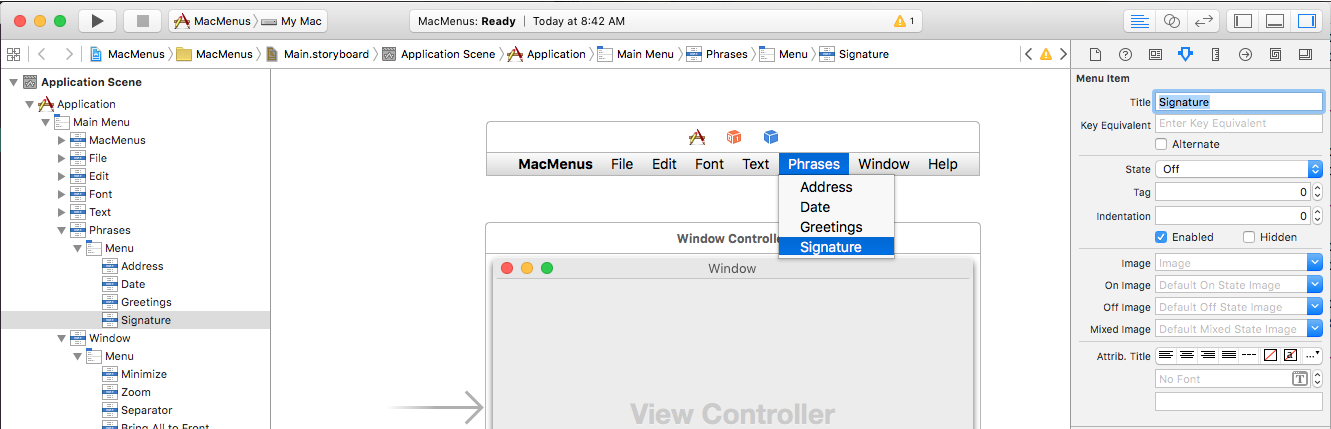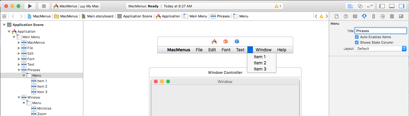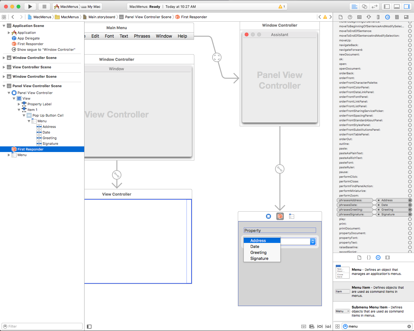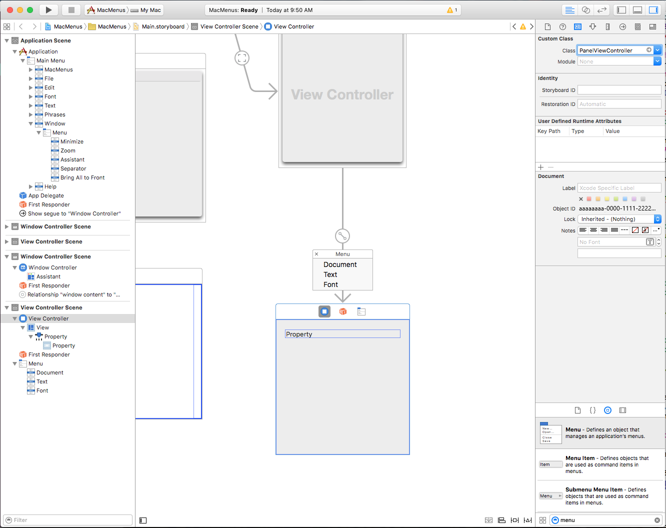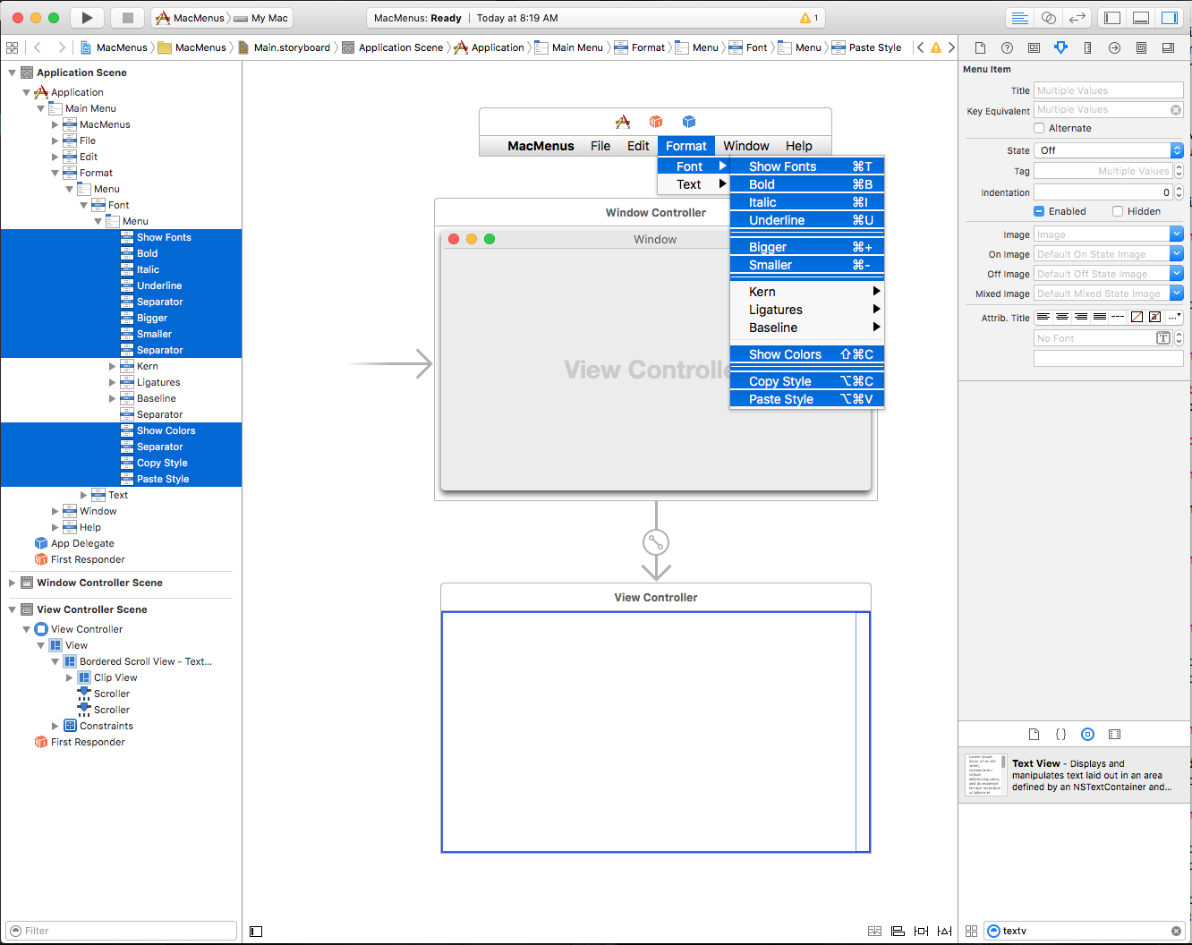 Ensuite, faites glisser un menu de l’inspecteur de bibliothèque sur le contrôleur de vue dans la hiérarchie d’affichage et renommez les trois éléments de menu par défaut Document, Texte et Police :