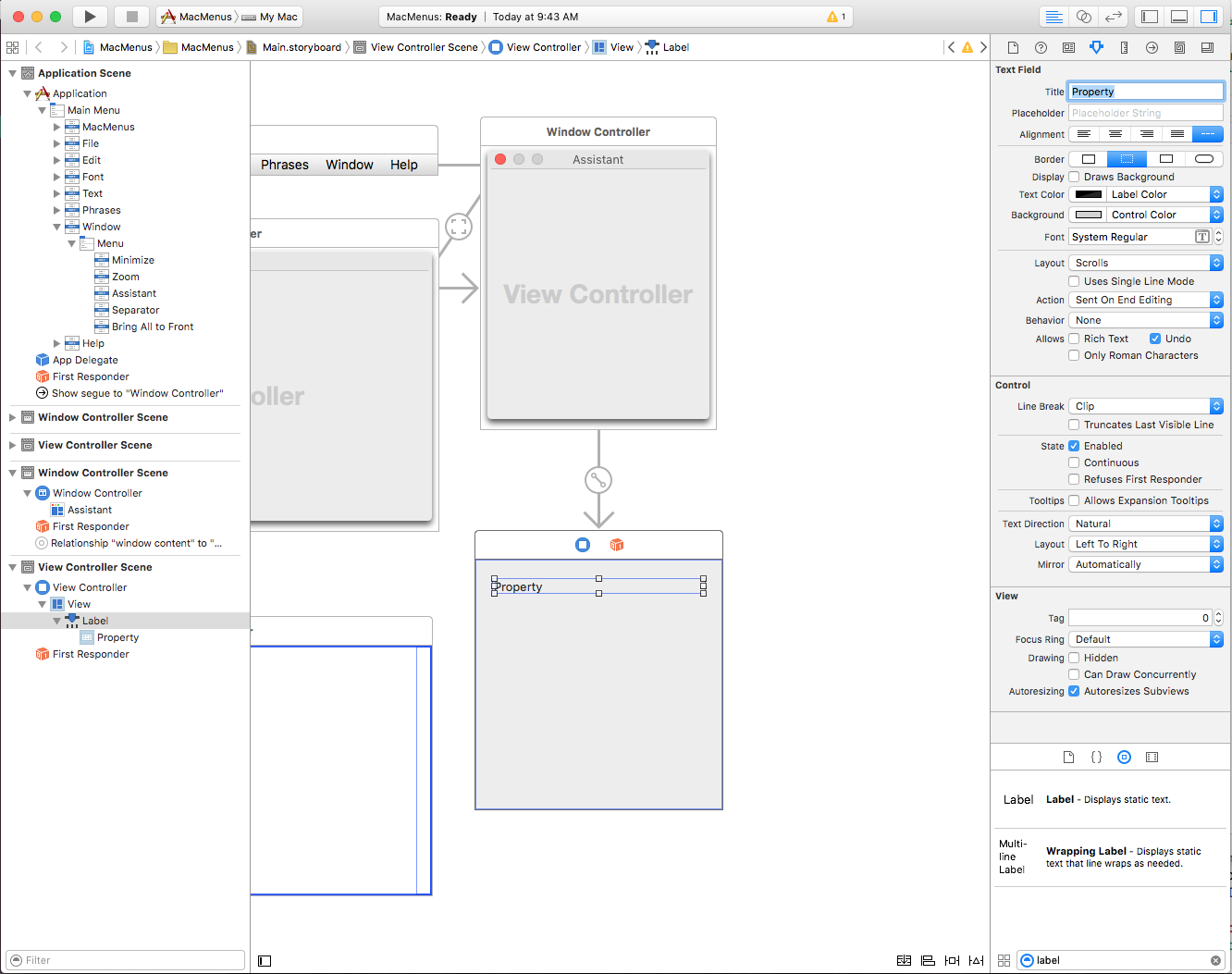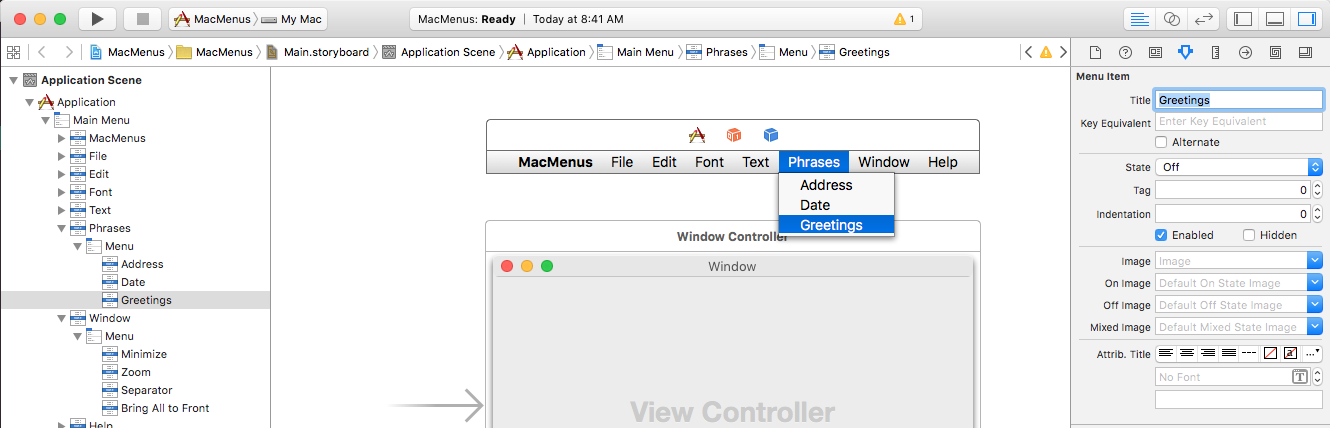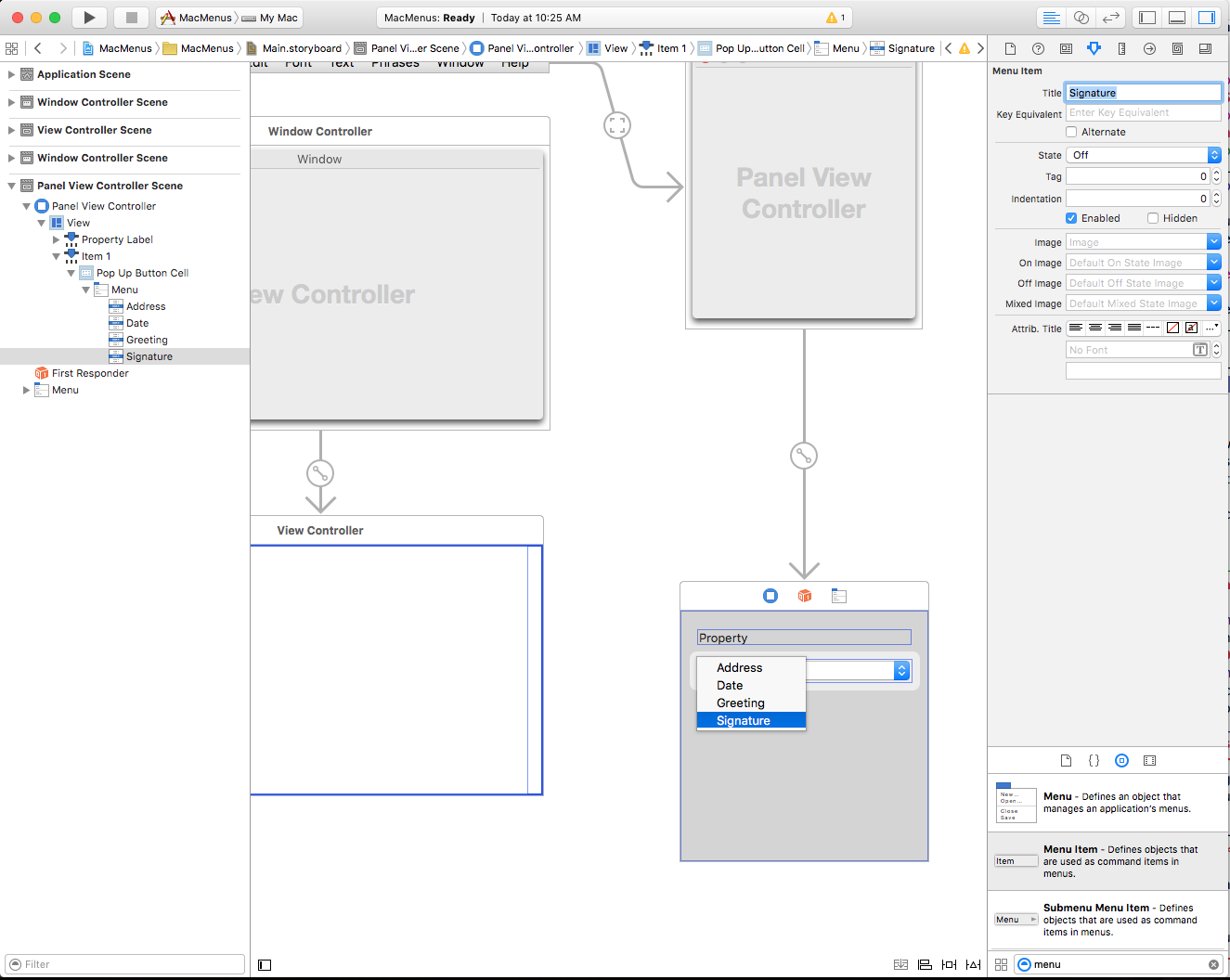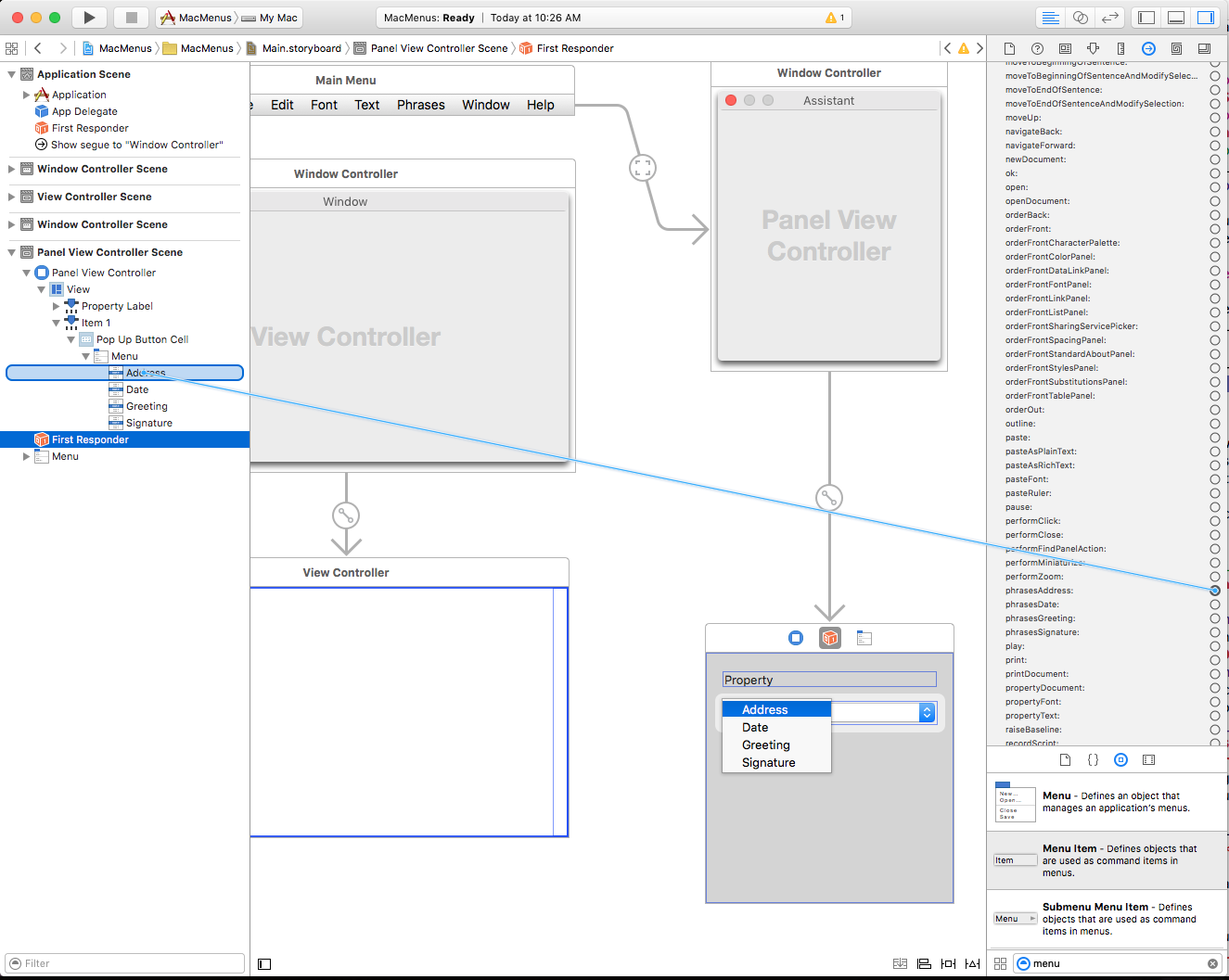 Ensuite, faites glisser un menu de l’inspecteur de bibliothèque sur le contrôleur de vue dans la hiérarchie d’affichage et renommez les trois éléments de menu par défaut Document, Texte et Police :