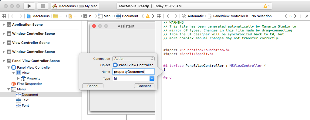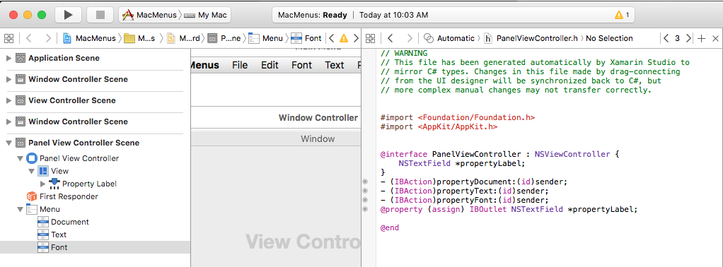 La ligne clé ici était [Export ("openDocument:")], il indique NSMenu que notre AppDelegate a une méthode void OpenDialog (NSObject sender) qui répond à l’action openDocument: . Si vous vous souvenez de ce qui précède, l’élément de menu Ouvrir est automatiquement câblé à cette action par défaut dans le Générateur d’interface :