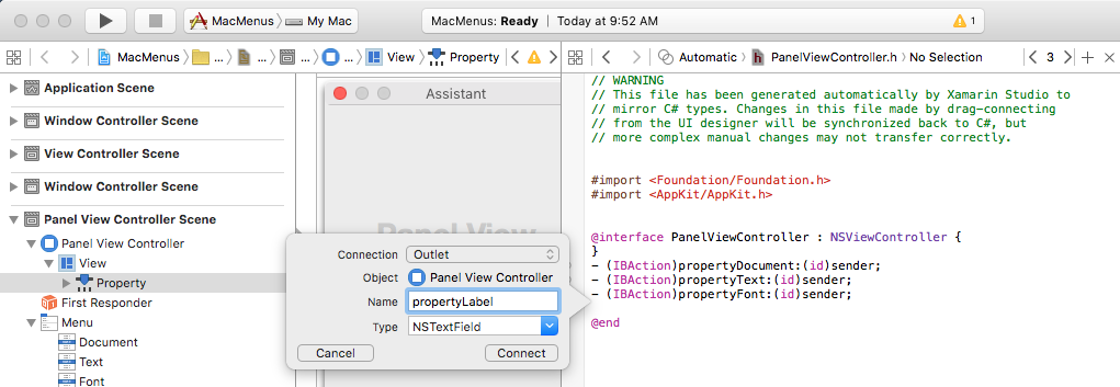 Basculez vers l’Éditeur Assistant et sélectionnez le fichier PanelViewController.h.