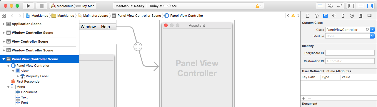 Nous allons modifier notre fichier Main.storyboard dans Xcode et ajouter une fenêtre Fenêtre à notre conception, définir sa classe sur « NSPanel » dans l’inspecteur d’identité, ajouter un nouvel élément Assistant au menu Fenêtre et l’attacher à la nouvelle fenêtre à l’aide d’un Show Segue :