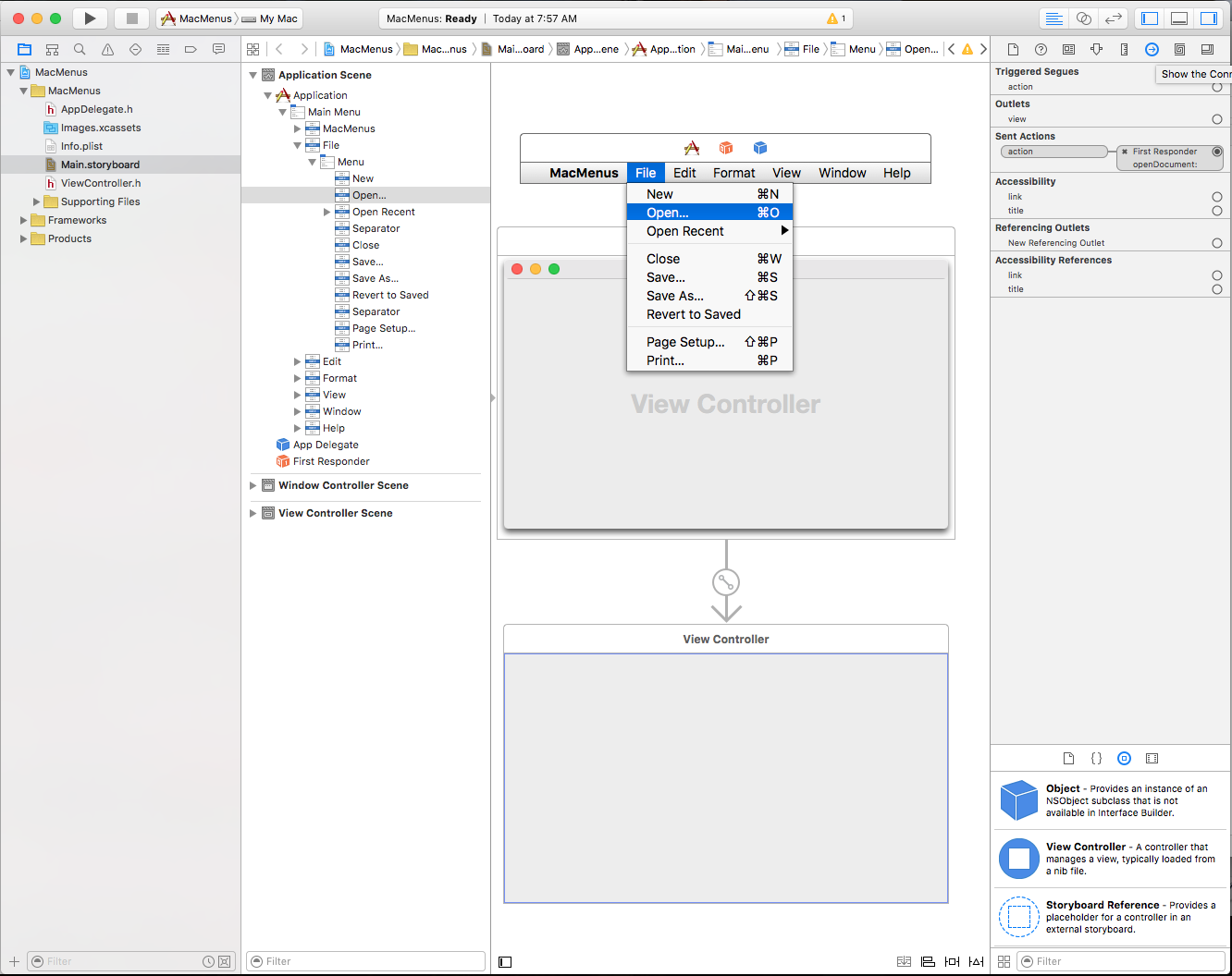 Si vous sélectionnez le premier répondeur dans la hiérarchie d’interface et faites défiler vers le bas dans l’inspecteur Connecter ion, et vous verrez la définition de l’action openDocument: à laquelle l’élément de menu Ouvrir est attaché (ainsi que plusieurs autres actions par défaut pour l’application qui sont et ne sont pas automatiquement câblées aux contrôles) :