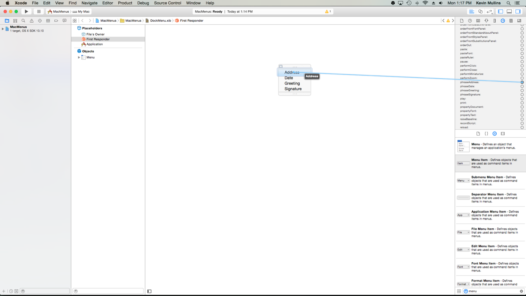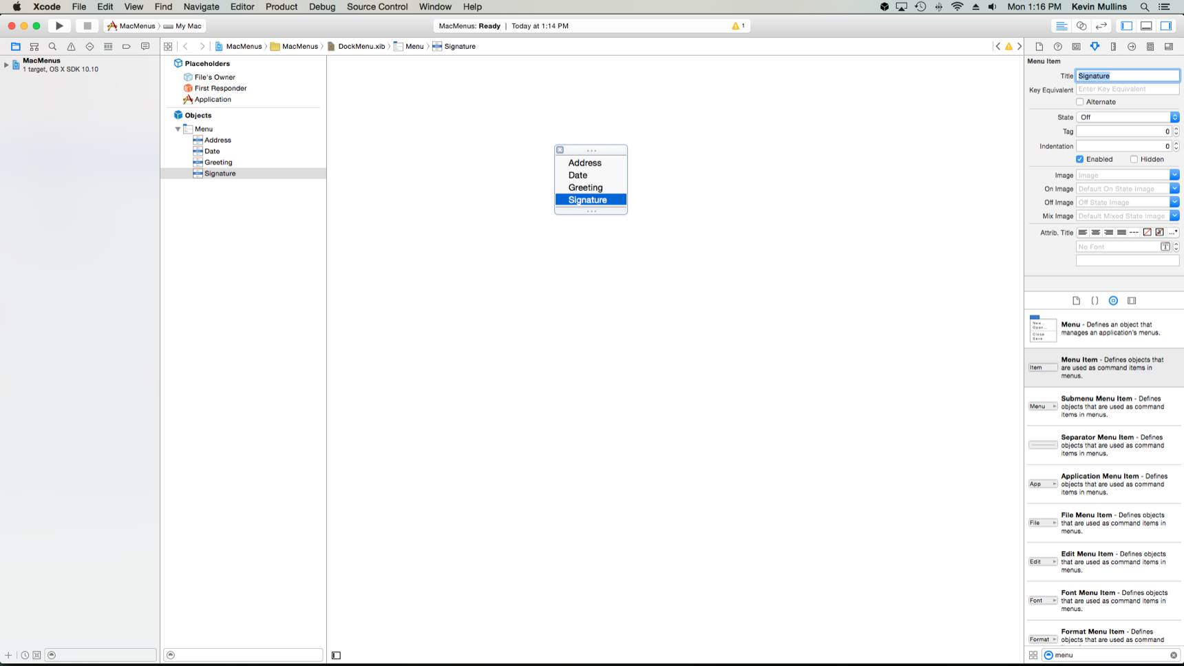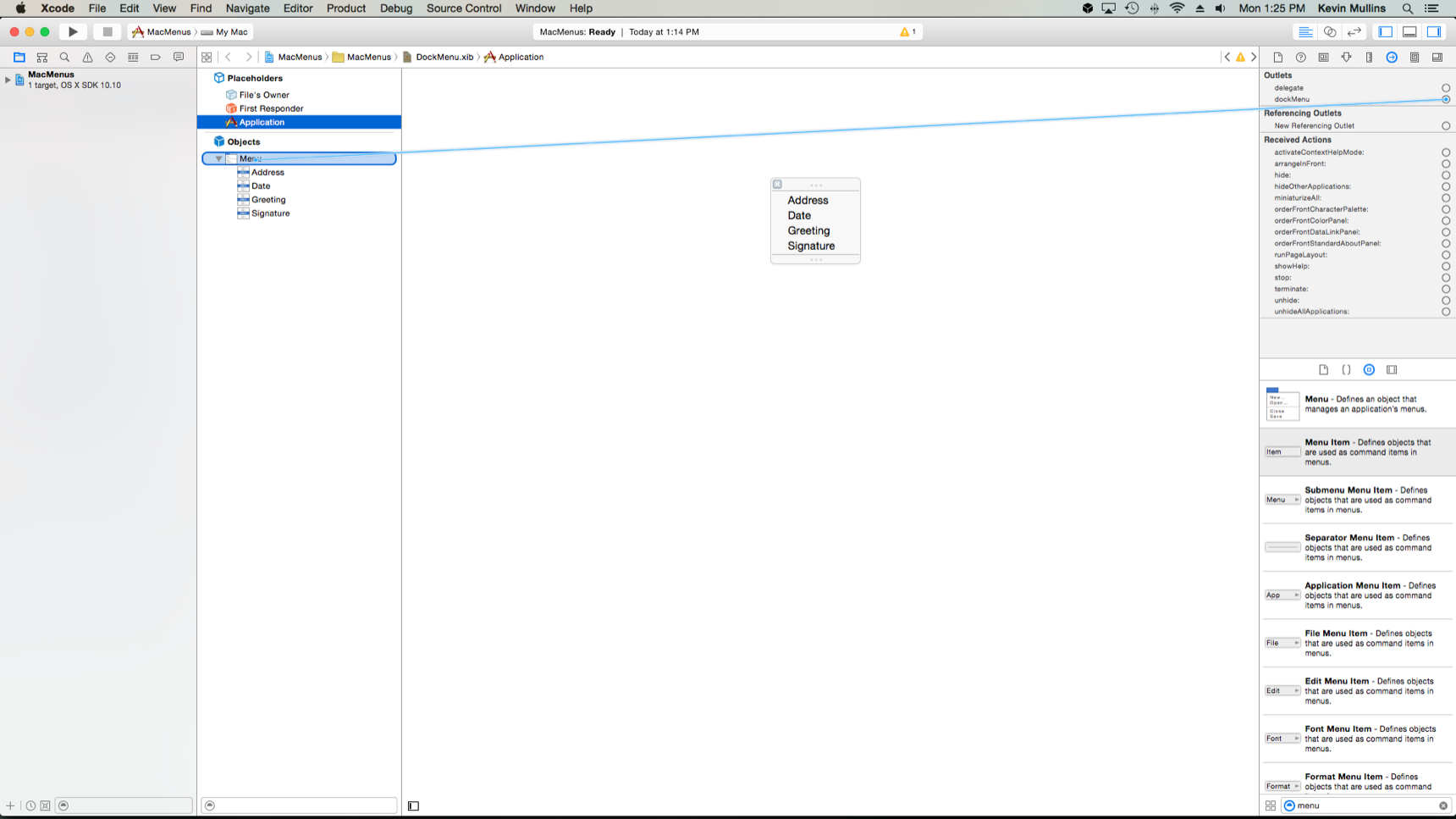 Dans le Panneau Solution, double-cliquez sur le fichier DockMenu.xib pour l’ouvrir pour modification dans Xcode. Créez un menu avec les éléments suivants : Adresse, Date, Message d’accueil et Signature