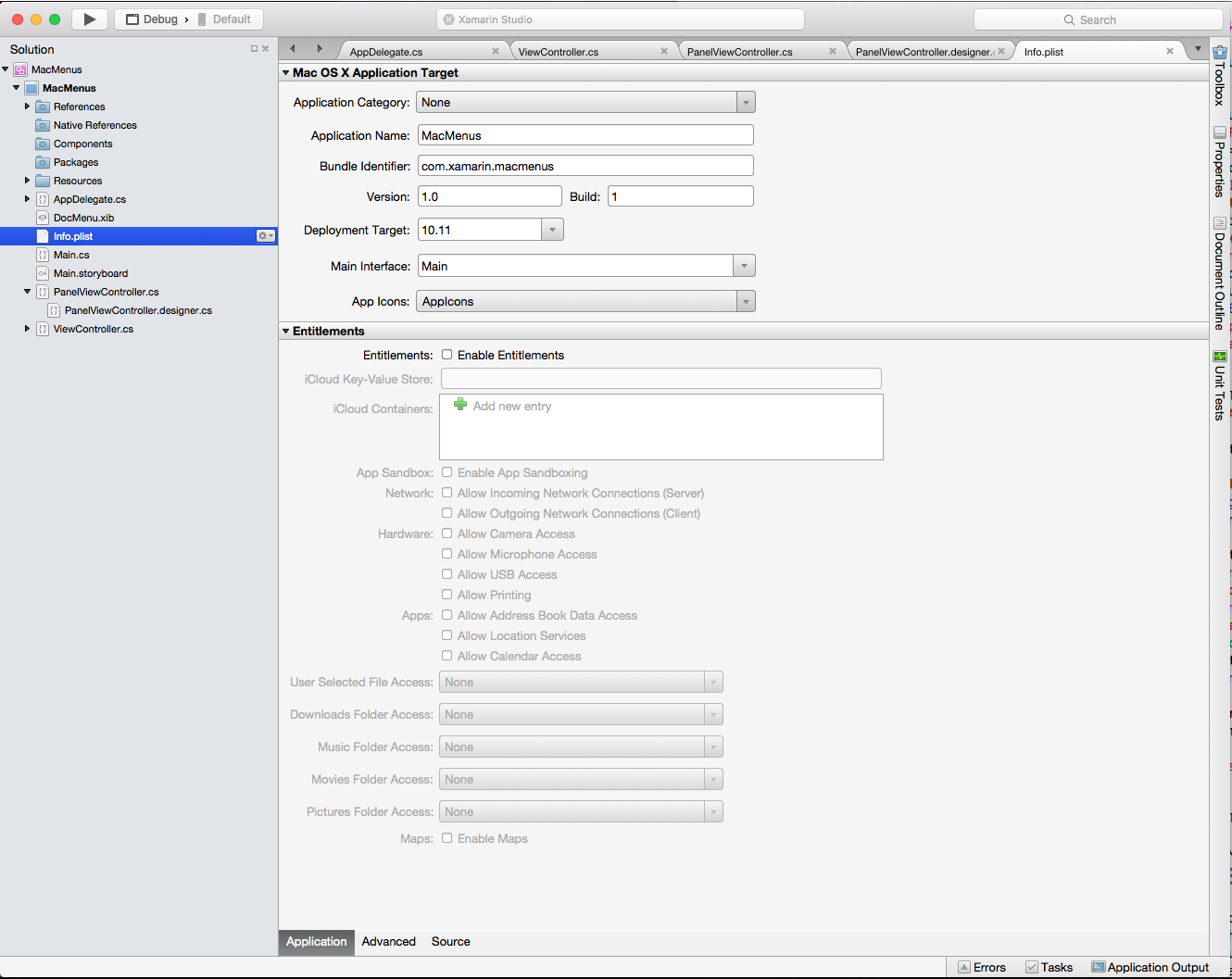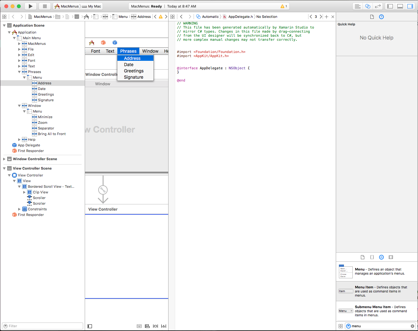 Lorsque vous utilisez C# et .NET dans une application Xamarin.Mac, vous avez accès aux mêmes menus Cocoa qu’un développeur travaillant dans Objective-C et Xcode. Étant donné que Xamarin.Mac s’intègre directement à Xcode, vous pouvez utiliser le Générateur d’interface de Xcode pour créer et gérer vos barres de menus, menus et éléments de menu (ou éventuellement les créer directement dans le code C#).