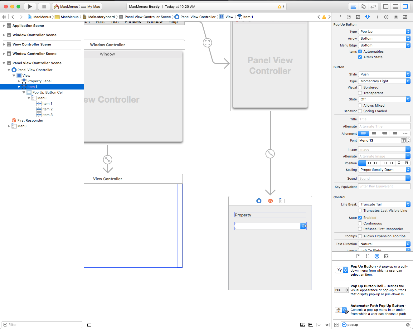 Modifiez le fichier Main.storyboard dans Xcode et faites glisser un bouton contextuel à partir de l’inspecteur de bibliothèque dans la fenêtre Panneau que nous avons créée dans la section Menus contextuels :