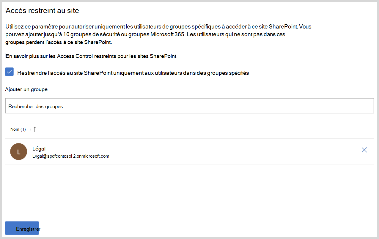 Sélectionnez la zone Restreindre l’accès au site SharePoint aux utilisateurs des groupes spécifiés case activée.