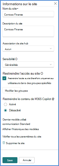 Une fois que le contrôle de restriction d’accès au site est délégué aux administrateurs de site, ils peuvent configurer le paramètre de restriction d’accès au site dans le panneau Informations sur le site.