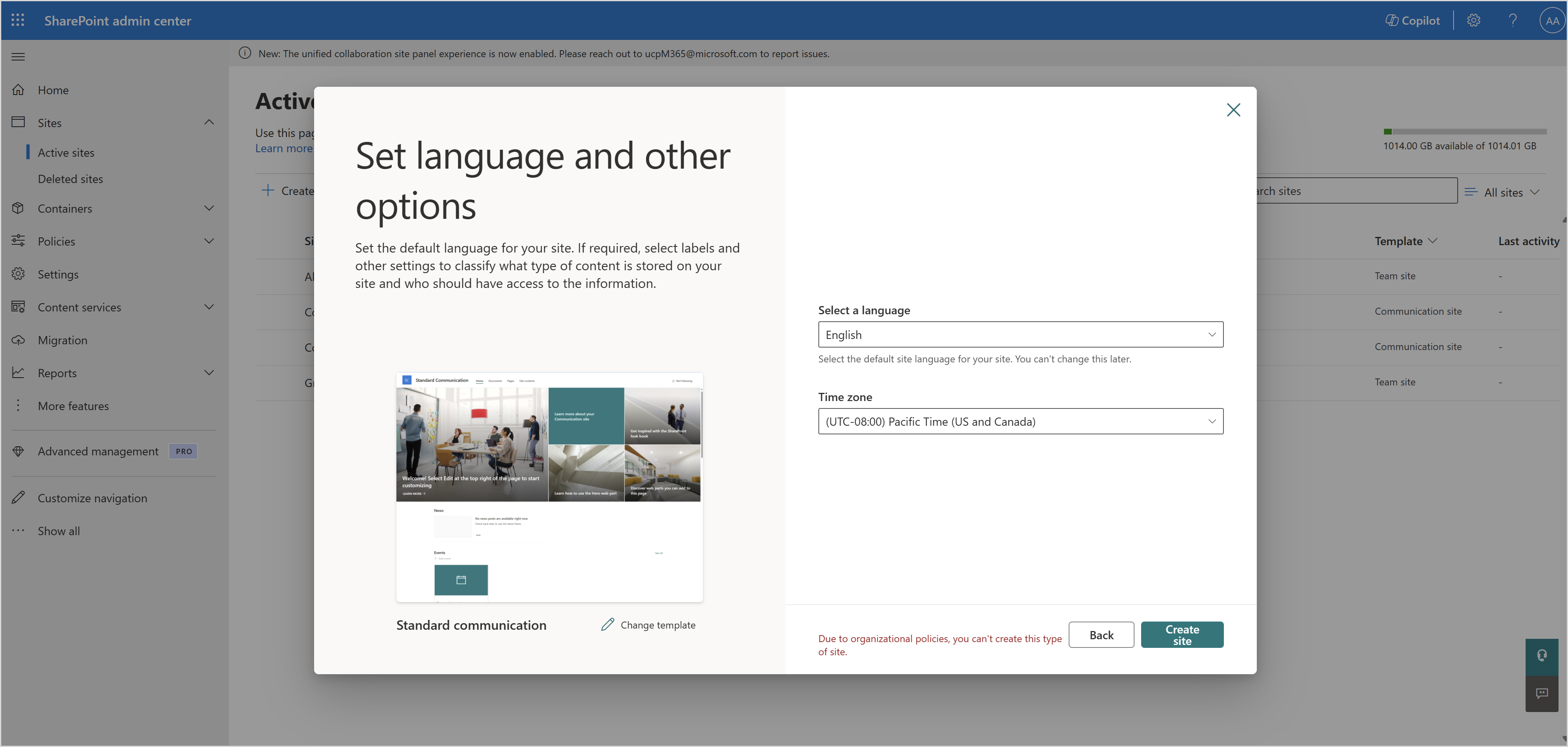 Lorsqu’un utilisateur crée un site de communication à partir du web, le message d’erreur « En raison de stratégies organisationnelles, vous ne pouvez pas créer ce type de site » s’affiche.
