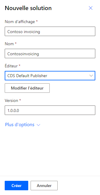 Entrez Contoso Invoicing pour Nom d’affichage, sélectionnez Éditeur CDS par défaut pour Éditeur, puis cliquez sur Créer. Lorsque vous travaillez sur un vrai projet, il est préférable de créer votre éditeur.