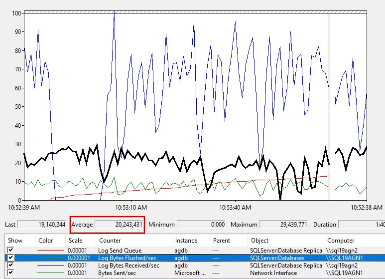 Il est également utile de comparer la valeur SQL Server ::D atabases ::Log Bytes Flushed/sec sur le réplica principal à SQL Server ::D atabase Replica ::Log Bytes Received/sec pour la même base de données sur le réplica secondaire. En moyenne, nous observons environ 20 Mo/s de modifications créées dans la base de données « agdb ». Toutefois, le réplica secondaire reçoit en moyenne seulement 5,4 Mo de modifications. Cela entraîne l’envoi du journal en file d’attente sur le réplica principal des modifications en attente dans le journal des transactions de base de données qui n’ont pas encore été envoyées au réplica secondaire.