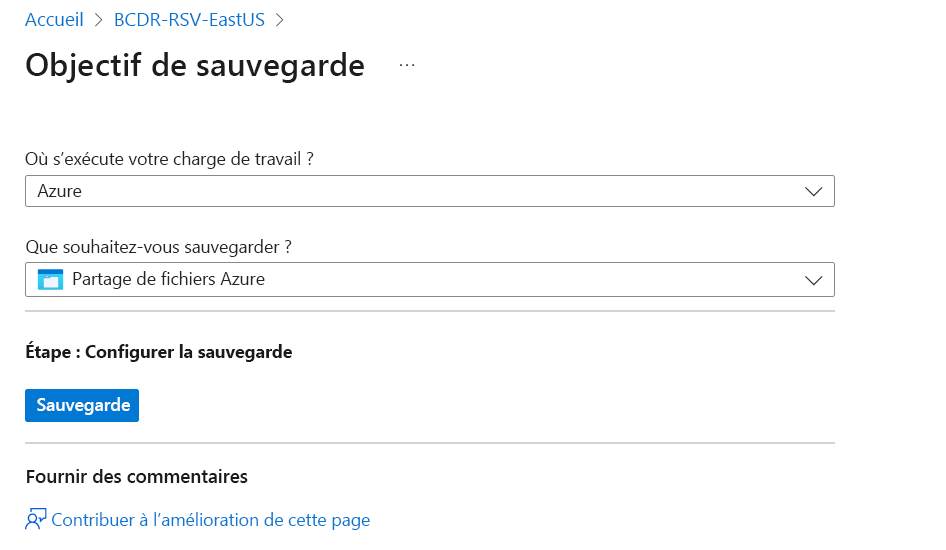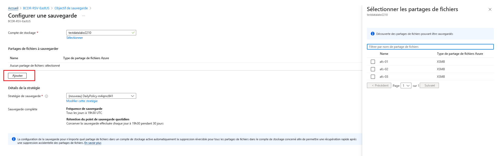 Pour configurer la sauvegarde de plusieurs partages de fichiers à partir du panneau du coffre Recovery Services, procédez comme suit :