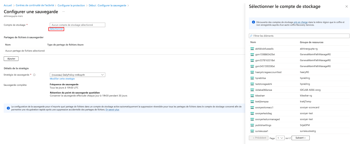 Sur le volet Configurer une sauvegarde, cliquez sur Sélectionner pour sélectionner le compte de stockage contenant les partages de fichiers à sauvegarder.