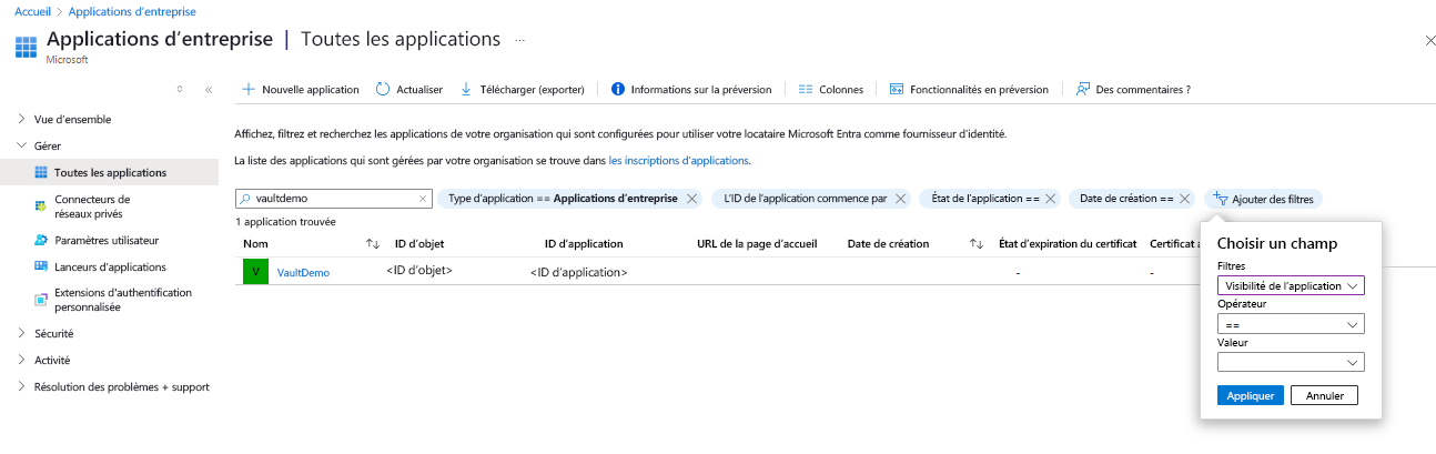 Remplacez la valeur du paramètre assignee par l’ID d’application de l’identité managée du coffre. Pour la valeur du scope paramètre, reportez-vous à votre conteneur spécifique. Pour obtenir l’ID d’application de l’identité managée du coffre, sélectionnez Toutes les applications sous Type d’application. Recherchez le nom du coffre et copiez la valeur de ID d’application.