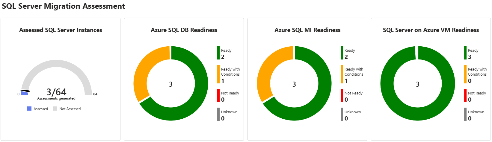 Cette section du tableau de bord vous fournit une vue d’ensemble de l’évaluation de la migration et de la préparation de la migration des instances de SQL Server activées par Azure Arc. Vous pouvez voir combien d’instances ont des évaluations disponibles. La préparation de la migration pour chaque offre Azure SQL s’affiche séparément.