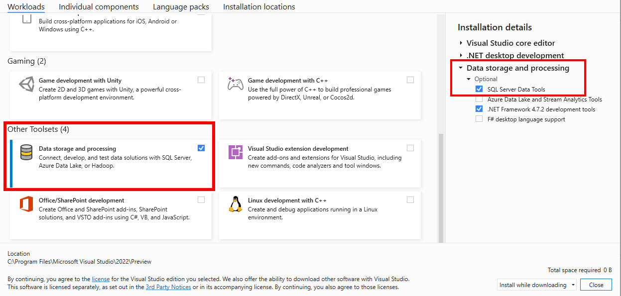 Sélectionnez SQL Server Data Tools sous Stockage et traitement des données dans la liste des charges de travail.
