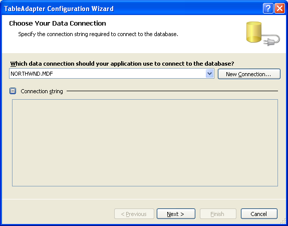 Après avoir cliqué sur Ajouter, lorsque vous êtes invité à ajouter le DataSet au App_Code dossier, choisissez Oui. Le Concepteur du Jeu de données typé s’affiche, et l’Assistant Configuration de TableAdapter démarre, ce qui vous permet d’ajouter votre premier TableAdapter au Jeu de données Typé.