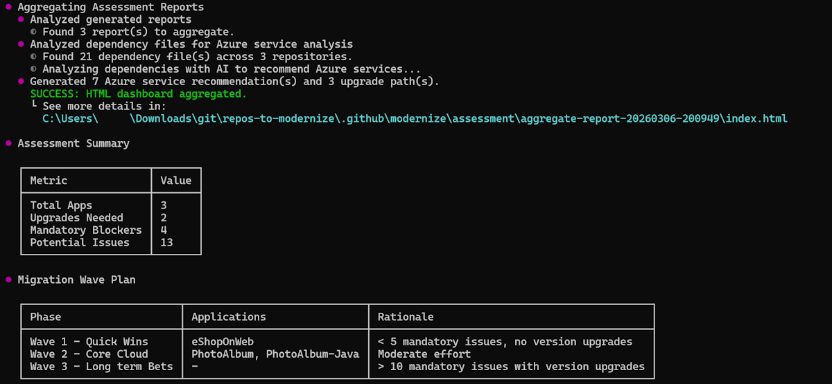 L’évaluation par lots est particulièrement utile pour la planification de la migration, car elle vous permet d’évaluer efficacement la préparation et les exigences de différentes applications en même temps. En utilisant l’évaluation par lots, vous pouvez évaluer différents référentiels en même temps et obtenir des rapports d’évaluation détaillés pour chaque application. Il produit deux types de rapports pour prendre en charge votre planification de la migration :