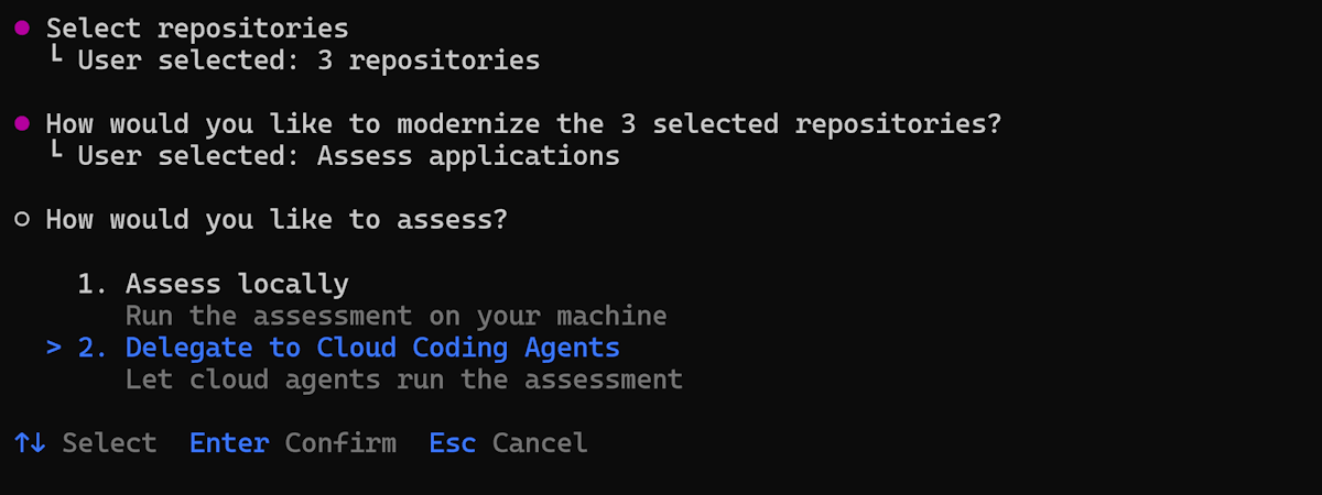- Délégation de l’Agent de codage cloud : l’agent de modernisation envoie des tâches à GitHub Cloud Coding Agents pour le traitement parallèle dans le cloud. Ce mode est plus rapide pour les scénarios multi-dépôts.