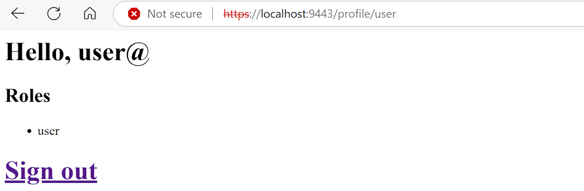 Sélectionnez le lien Se connecter en tant qu’utilisateur. Connectez-vous avec l’utilisateur régulier que vous avez créé précédemment. Après vous être connecté, Microsoft Entra ID vous redirige vers la page de profil, où vous voyez votre nom et vos rôles.