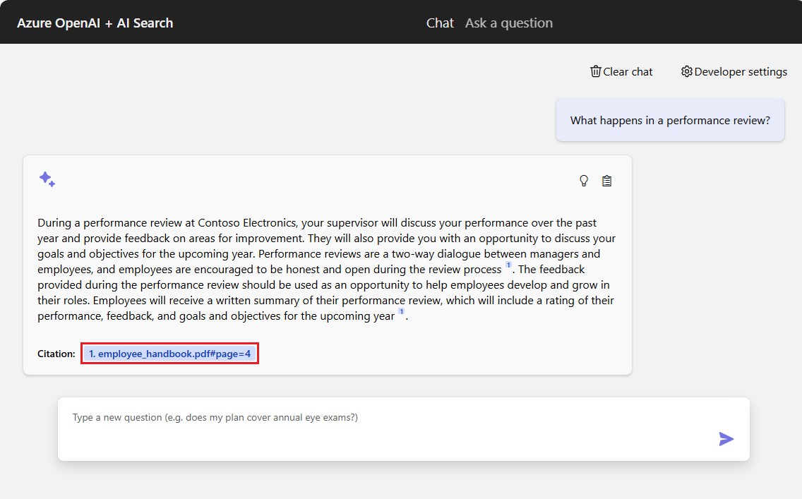 L’application de conversation est préchargée avec des informations sur les avantages sociaux des employés provenant de fichiers PDF. Vous pouvez utiliser l’application de conversation pour poser des questions sur les avantages sociaux. Les étapes suivantes vous guident tout au long du processus d’utilisation de l’application de conversation. Vos réponses peuvent varier à mesure que les modèles sous-jacents sont mis à jour.
