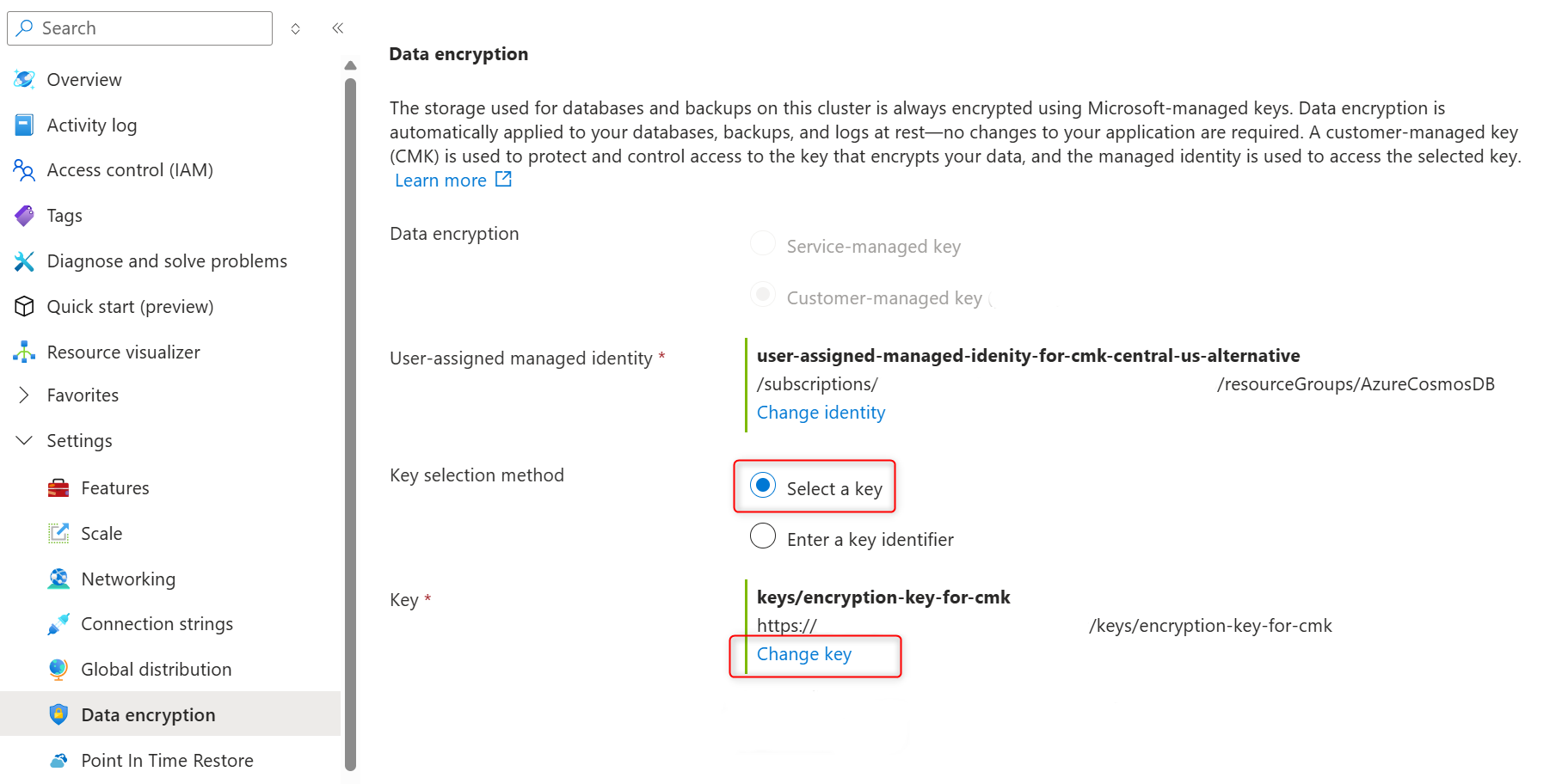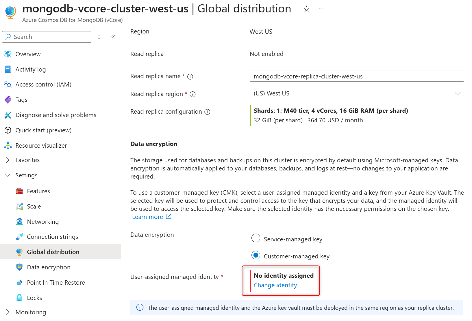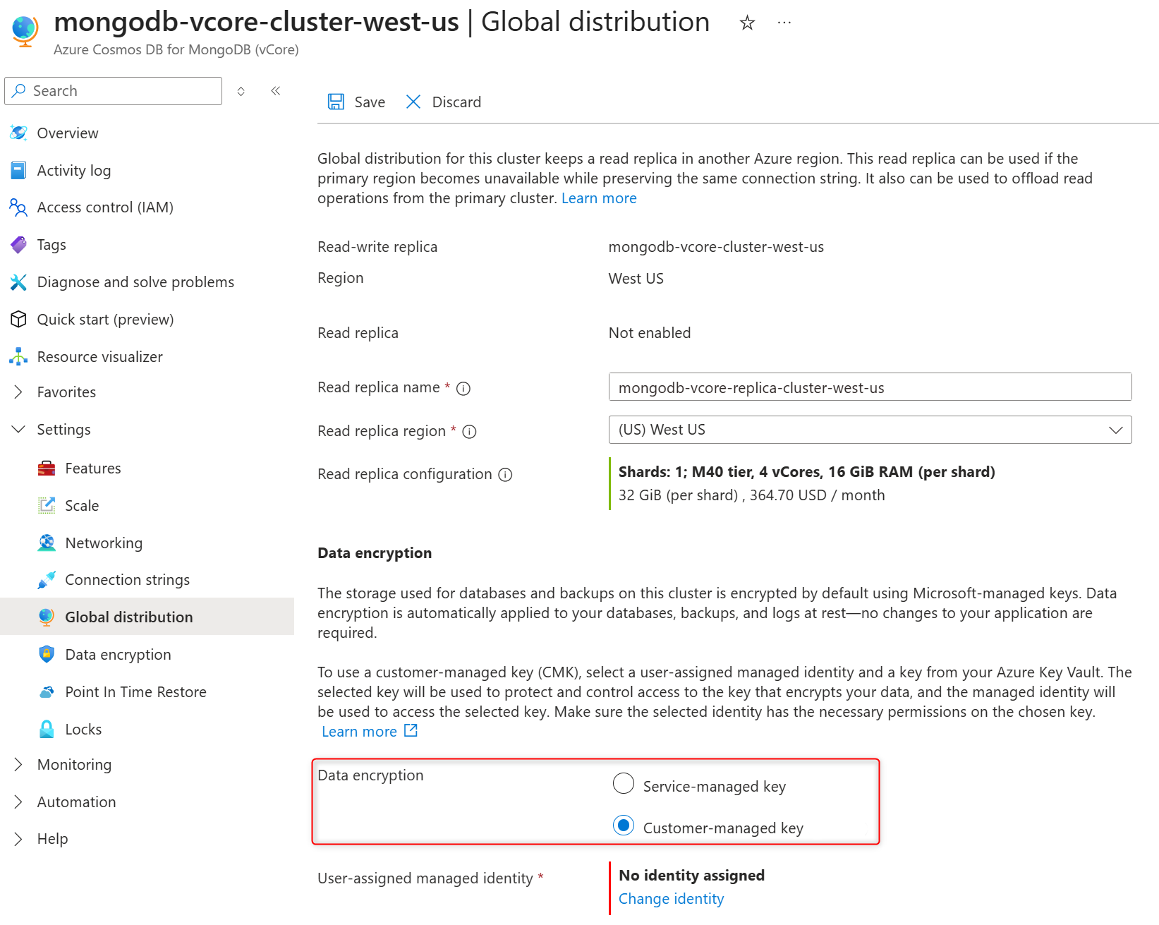 Dans la section Chiffrement des données, sélectionnez la Clé gérée par le client pour activer la CMK ou la Clé gérée par le service pour désactiver la CMK sur le cluster de réplicas.
