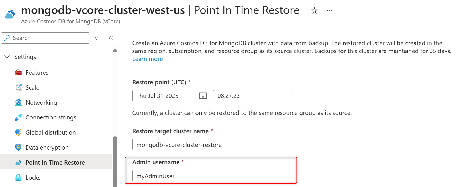 Entrez un nom d’administrateur de cluster pour le cluster restauré dans le champ Nom d’utilisateur administrateur.