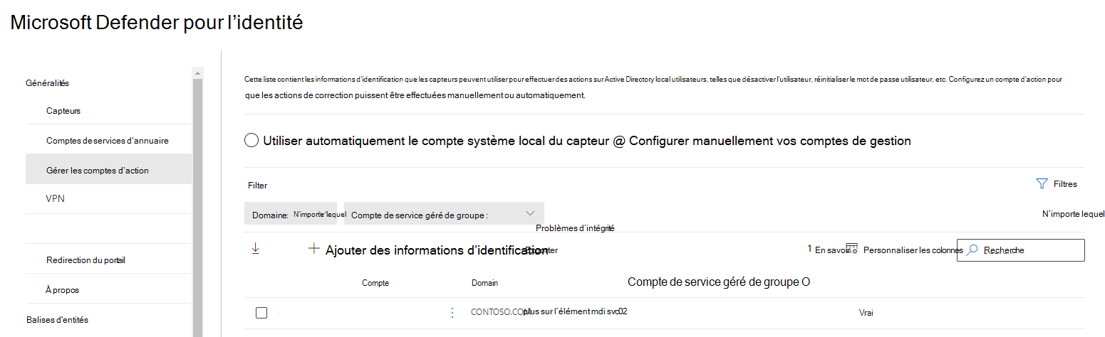 Accédez au portail Microsoft Defender et sélectionnez Paramètres ->Identités>Microsoft Defender pour Identity Gérer les > comptes >d’action+Créer un compte.