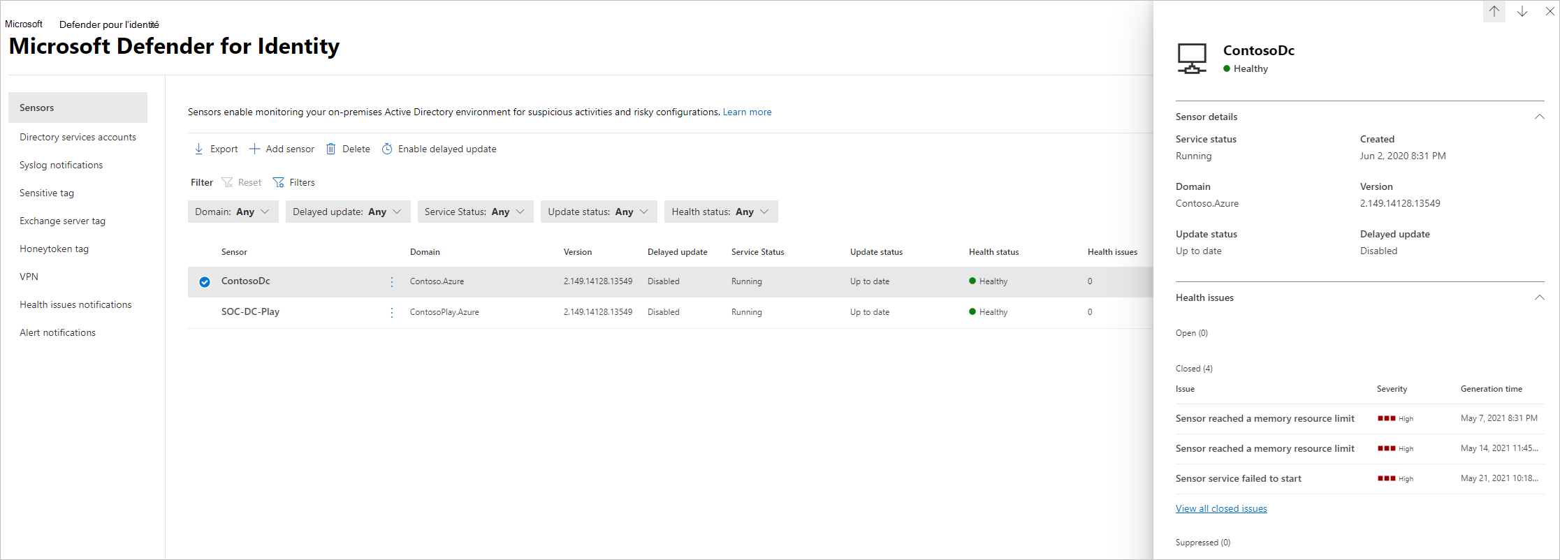 Capteur Entra Connect. Si votre capteur est installé sur un serveur de contrôleur de domaine avec Entra Connect configuré, par exemple dans un environnement de test, le type de capteur est affiché sous la forme Capteur de contrôleur de domaine à la place.